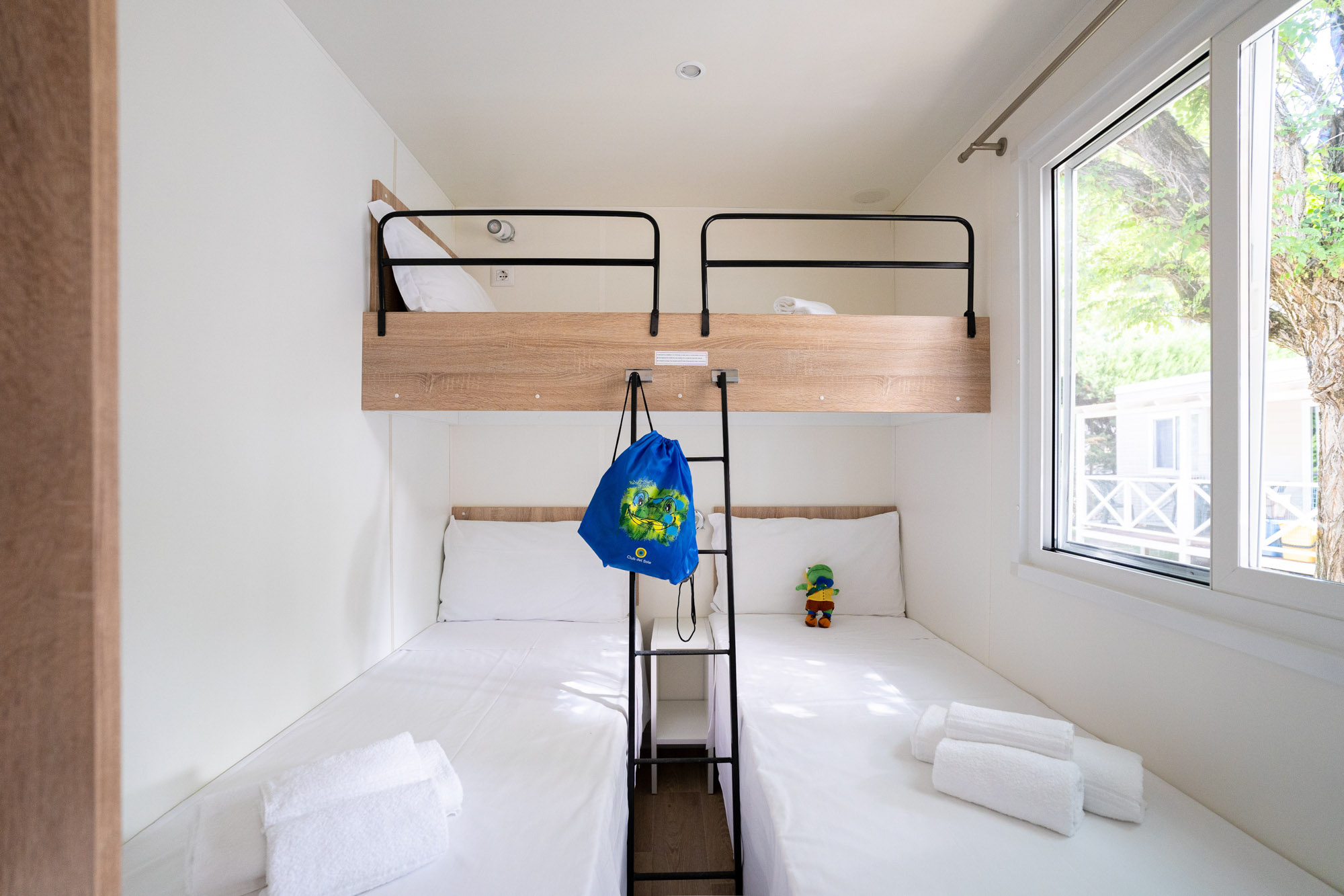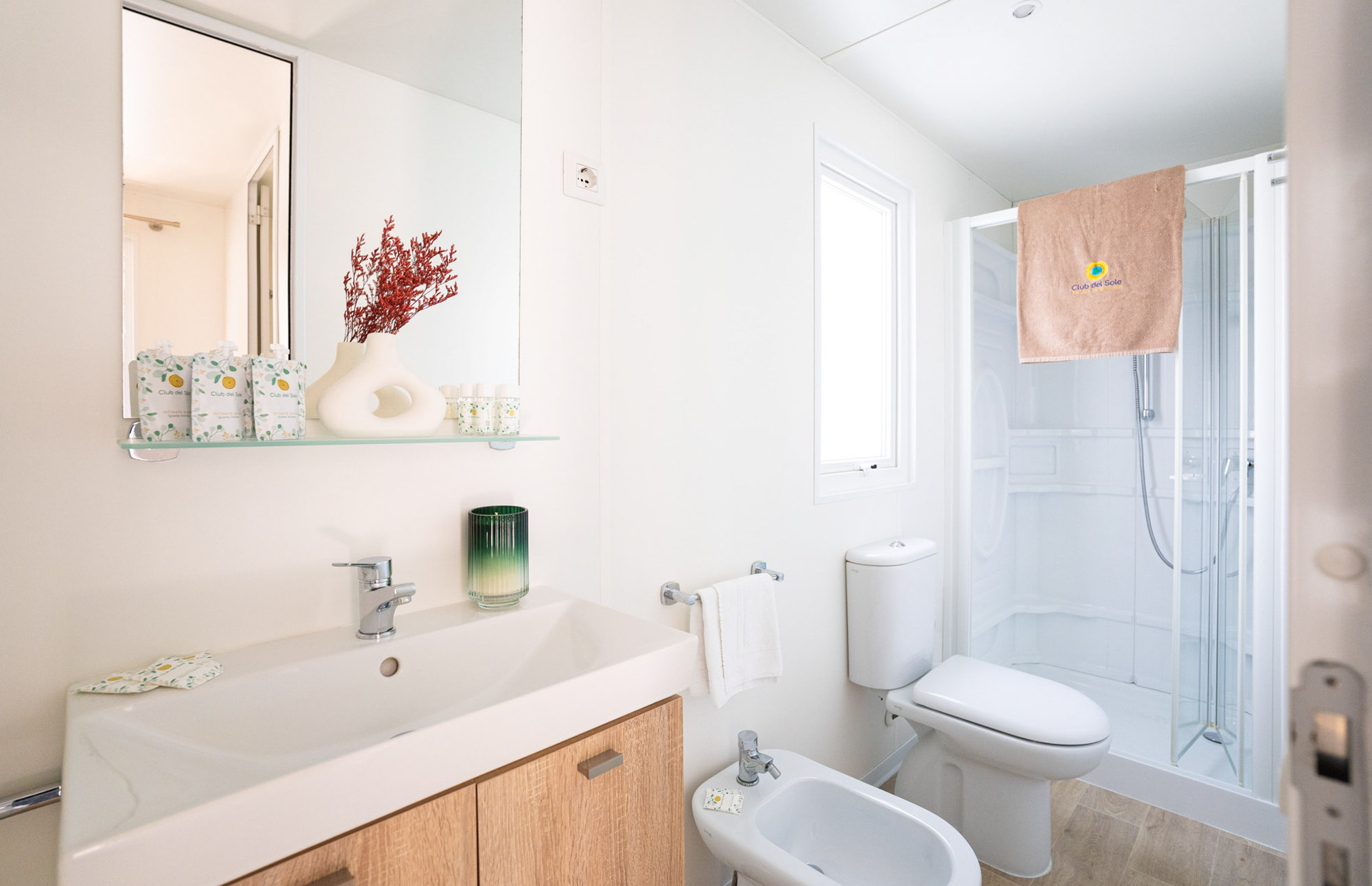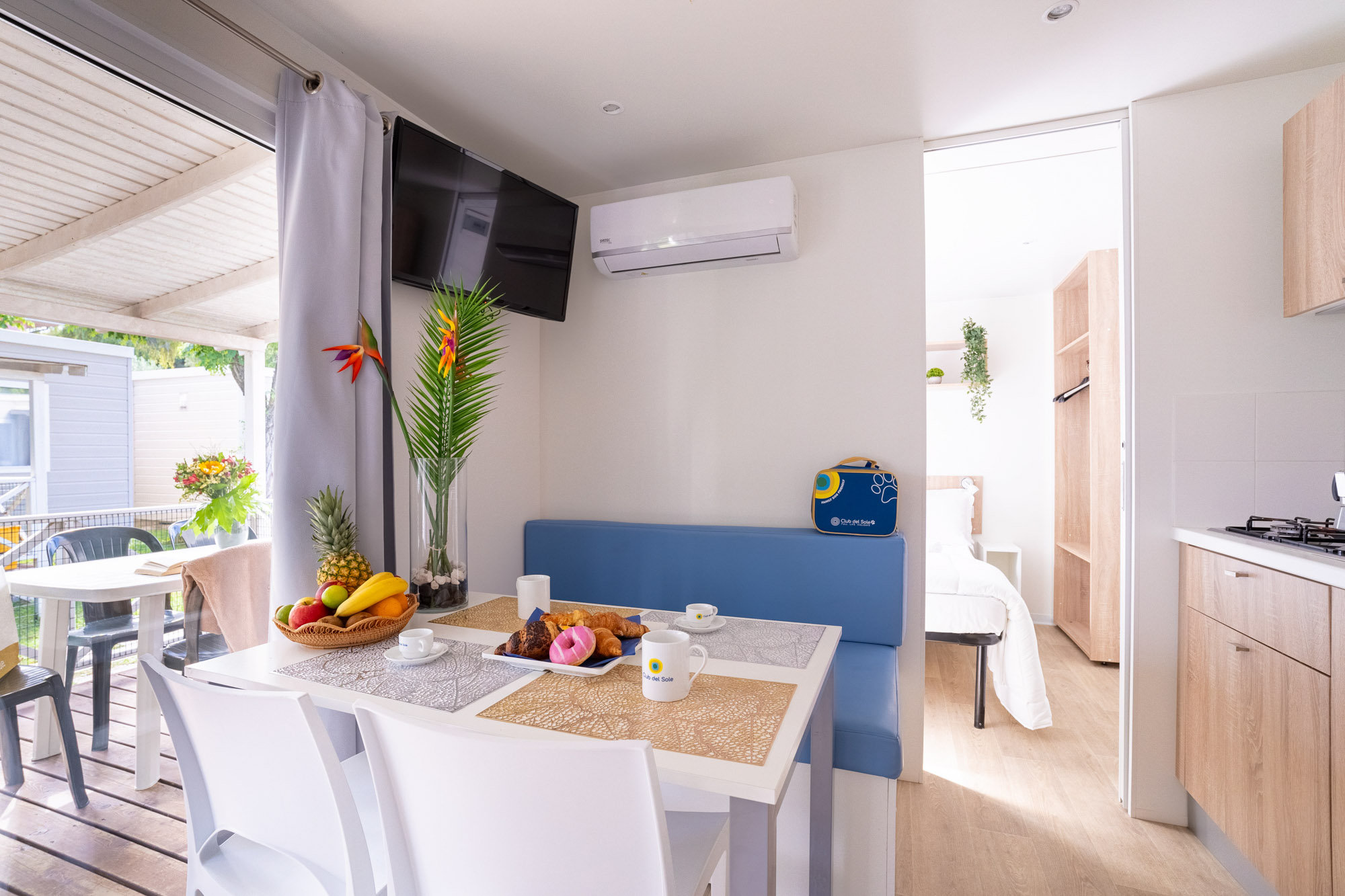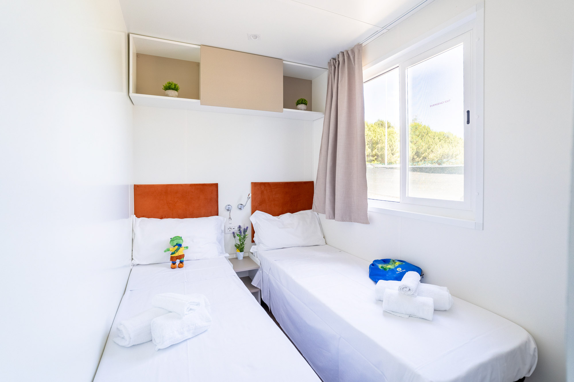 Eine funktionelle Unterkunft in ruhiger Lage, aber in unmittelbarer Nähe zu allen Dienstleistungen des Feriendorfes.