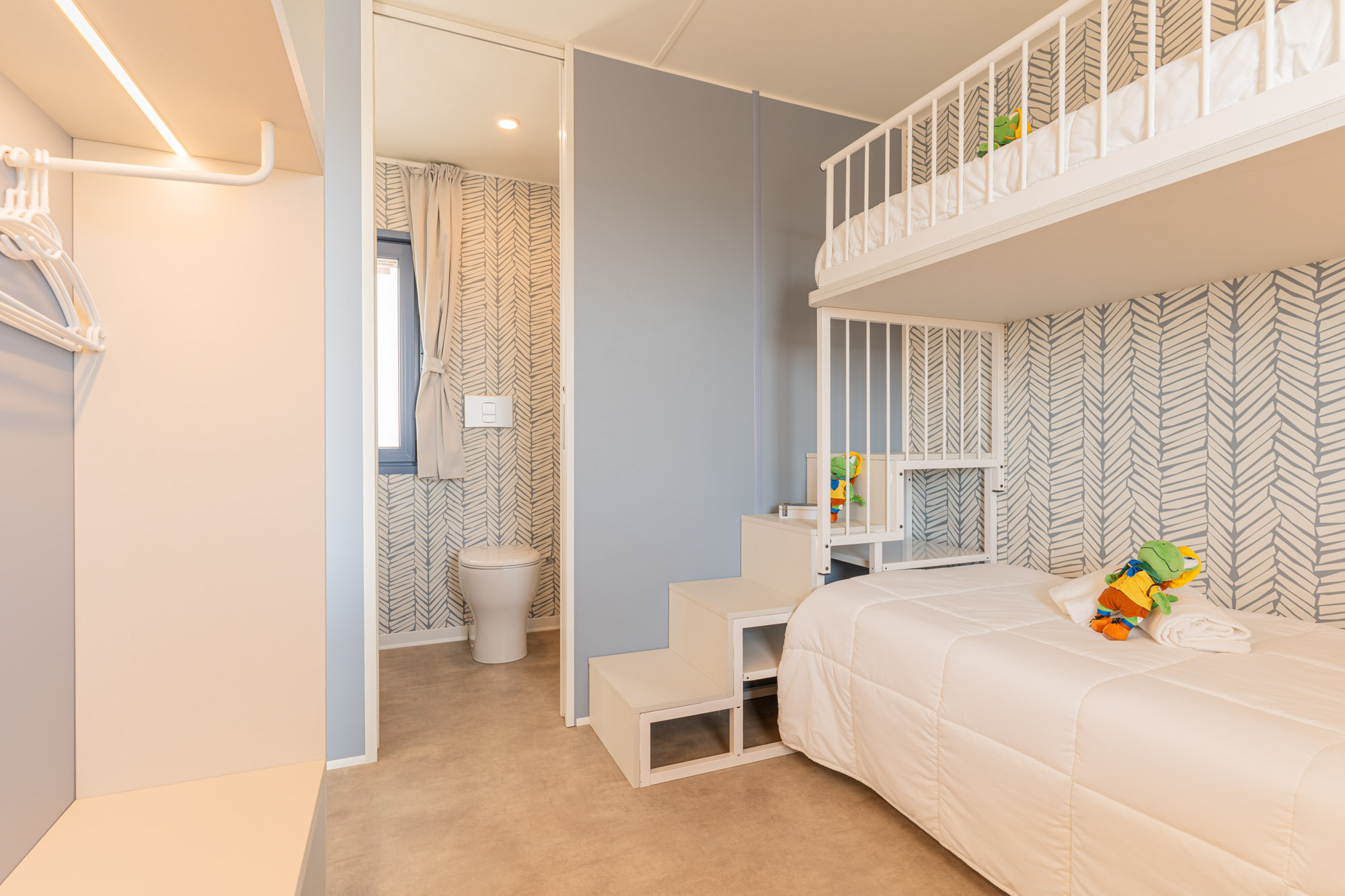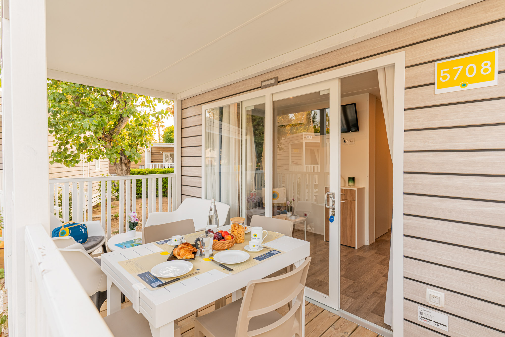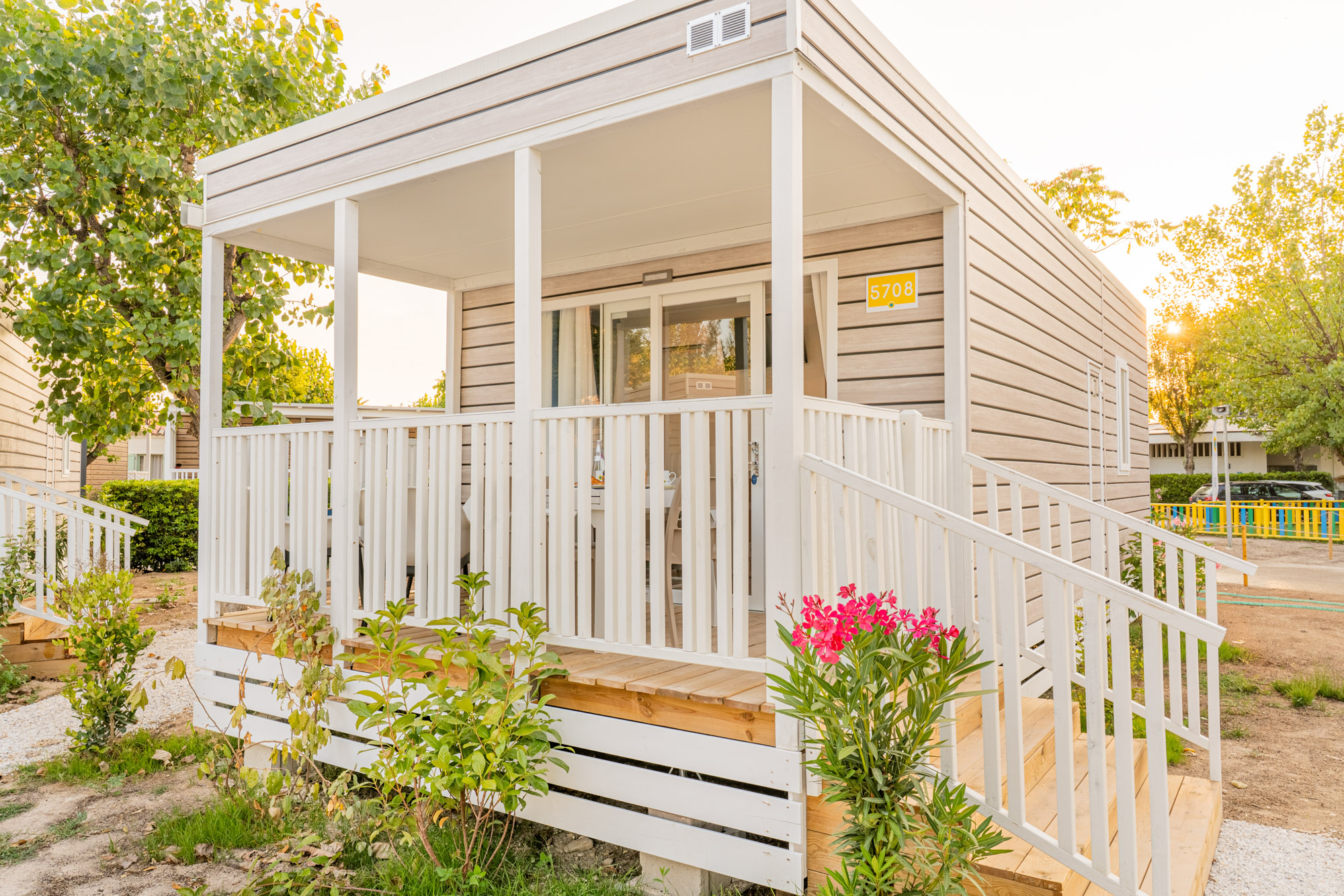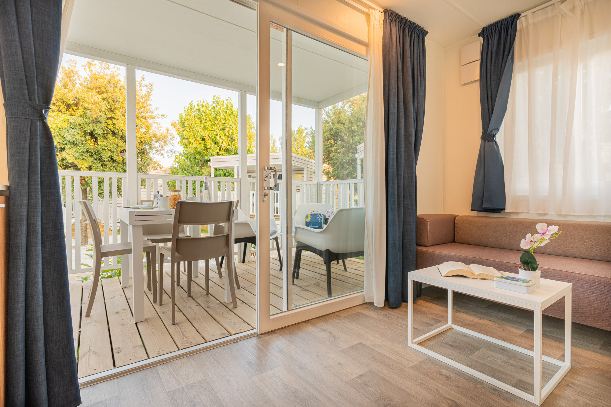 Minimale Reihe Bungalow mit 2 Zimmer, um einen Urlaub zur zweit ins Freie zu leben. Drinnen finden Sie eine kleine Living Ecke, perfekt für den Frühstück oder für die Hausaufgabe
