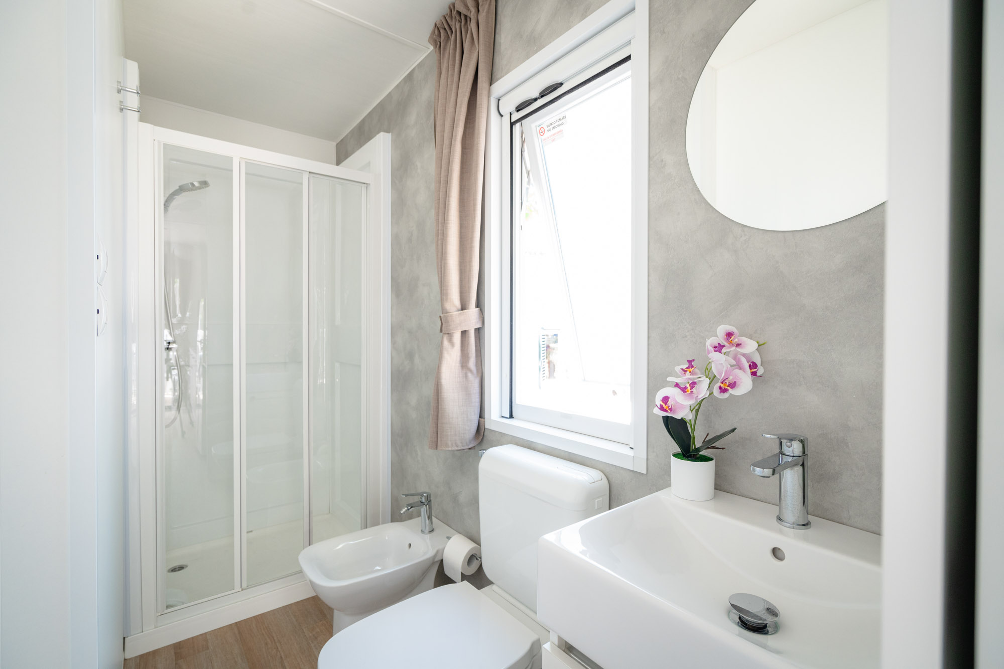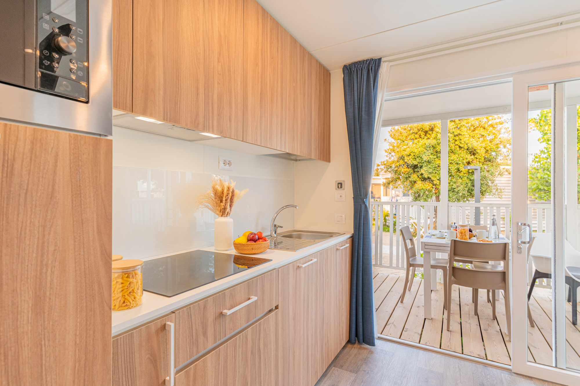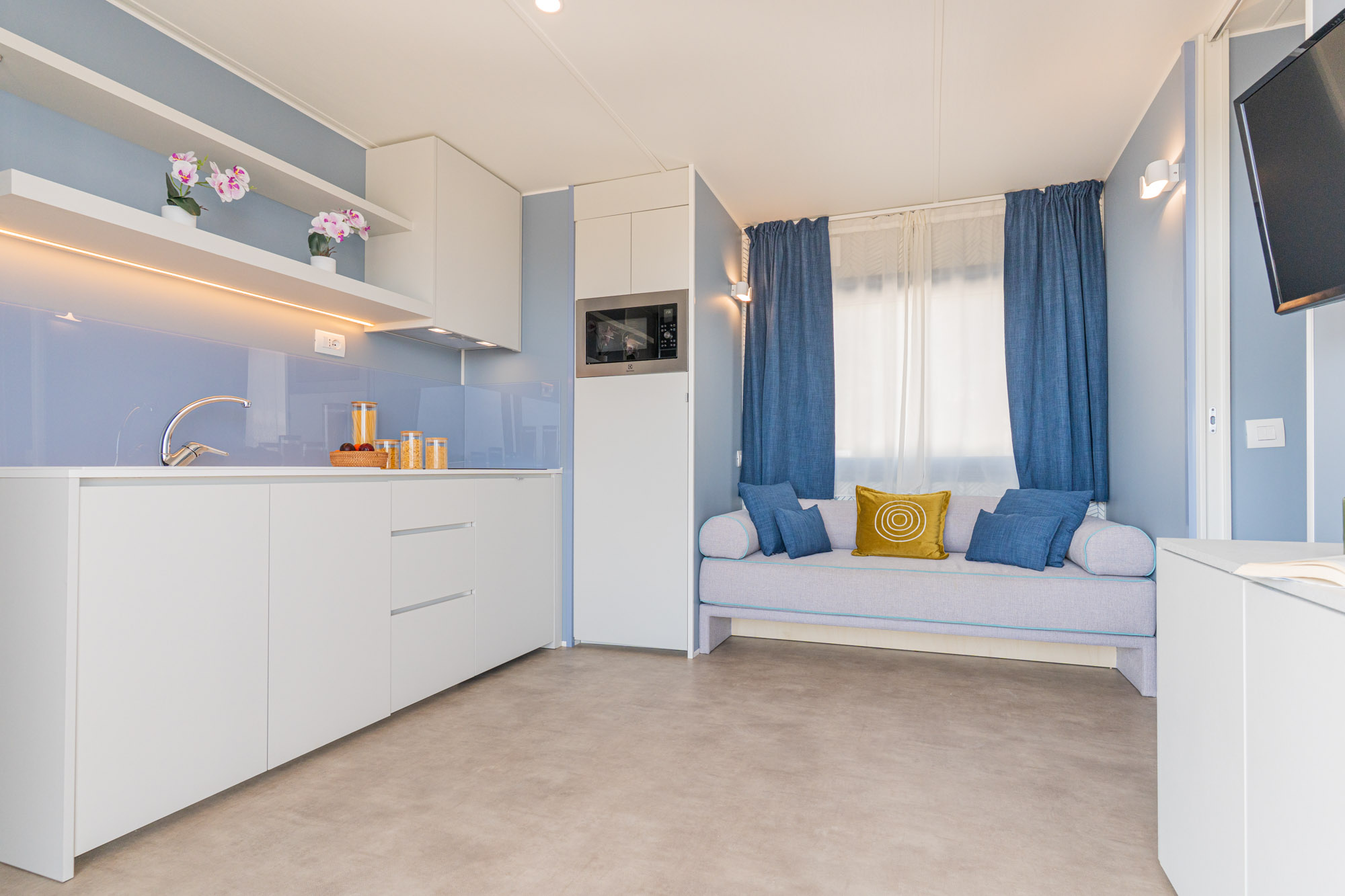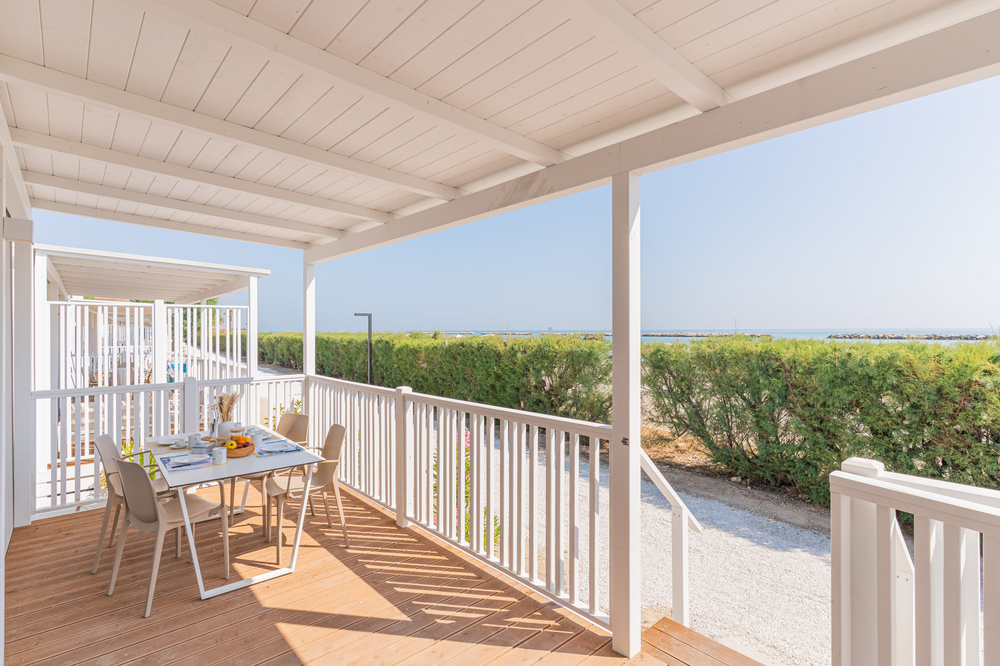 Minimale Reihe Bungalow mit 2 Zimmer, um einen Urlaub zur zweit ins Freie zu leben. Drinnen finden Sie eine kleine Living Ecke, perfekt für den Frühstück oder für die Hausaufgabe