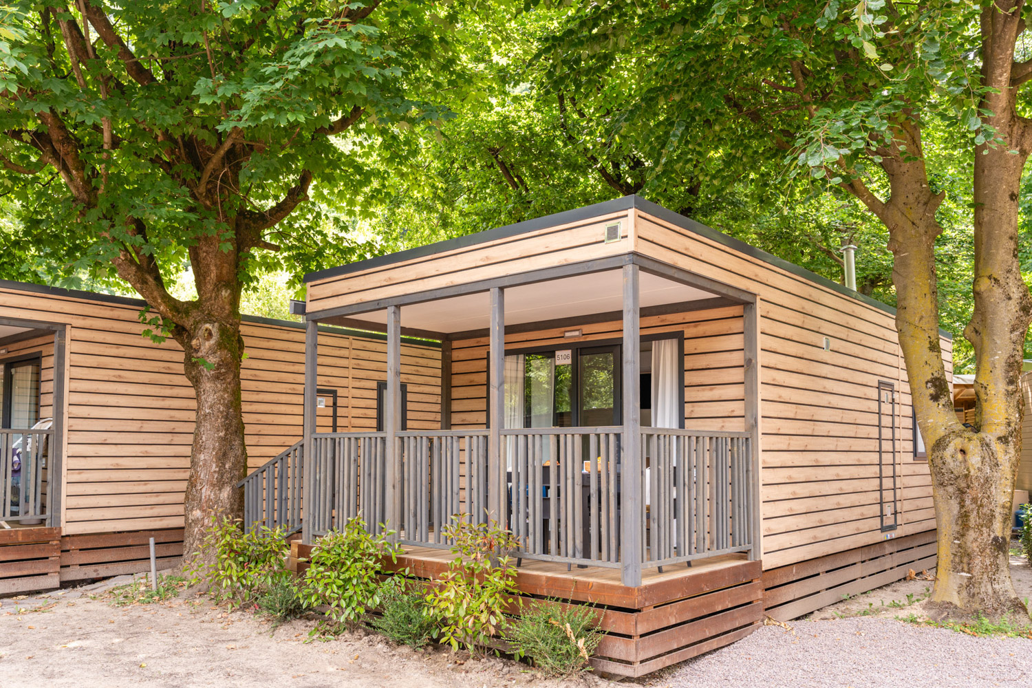 - Überdachte Holzveranda mit Gartentisch und -stühlen