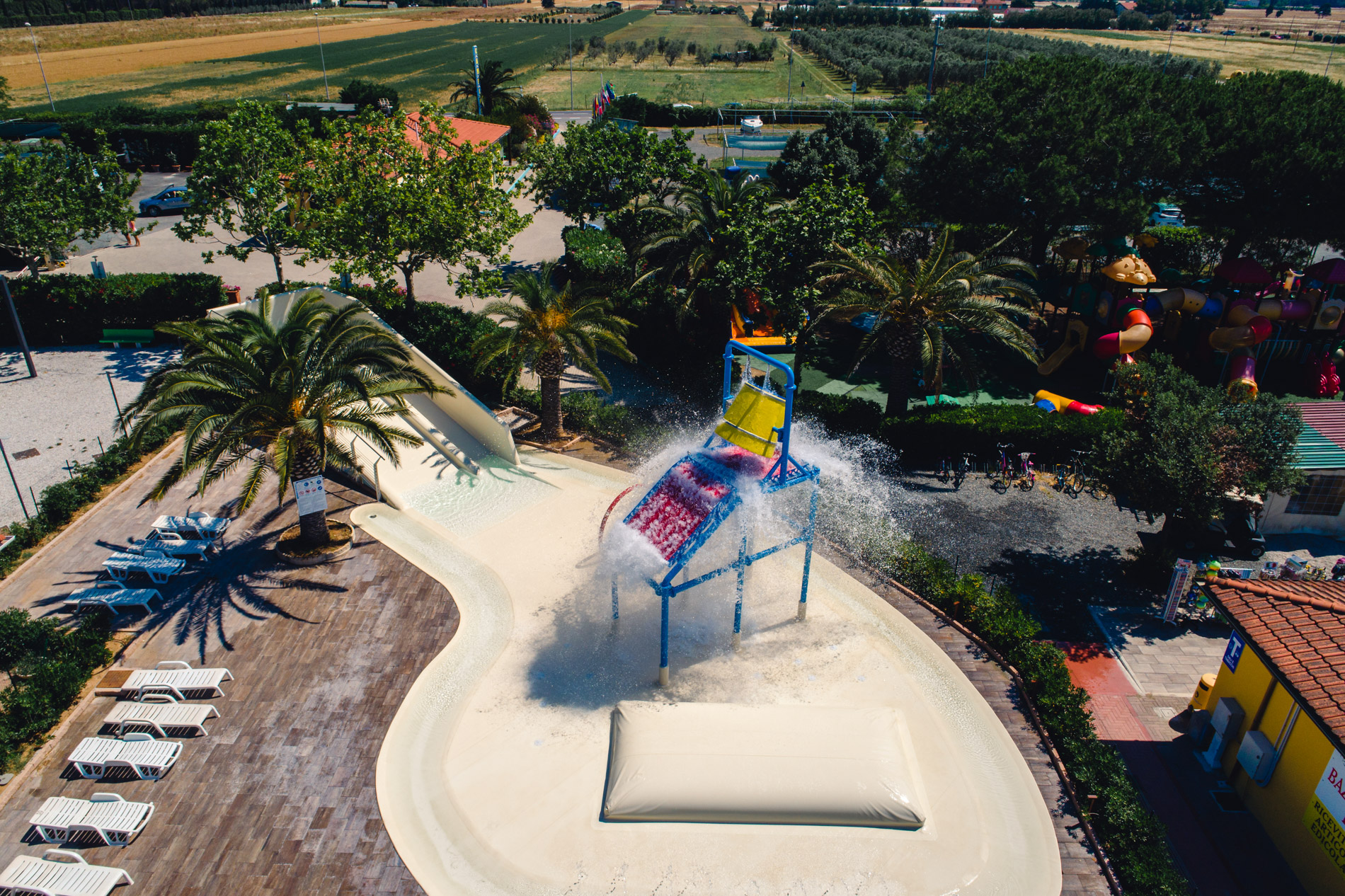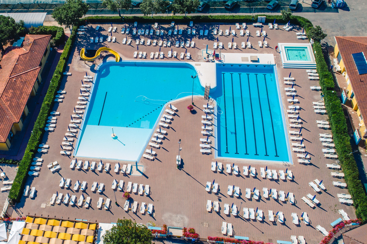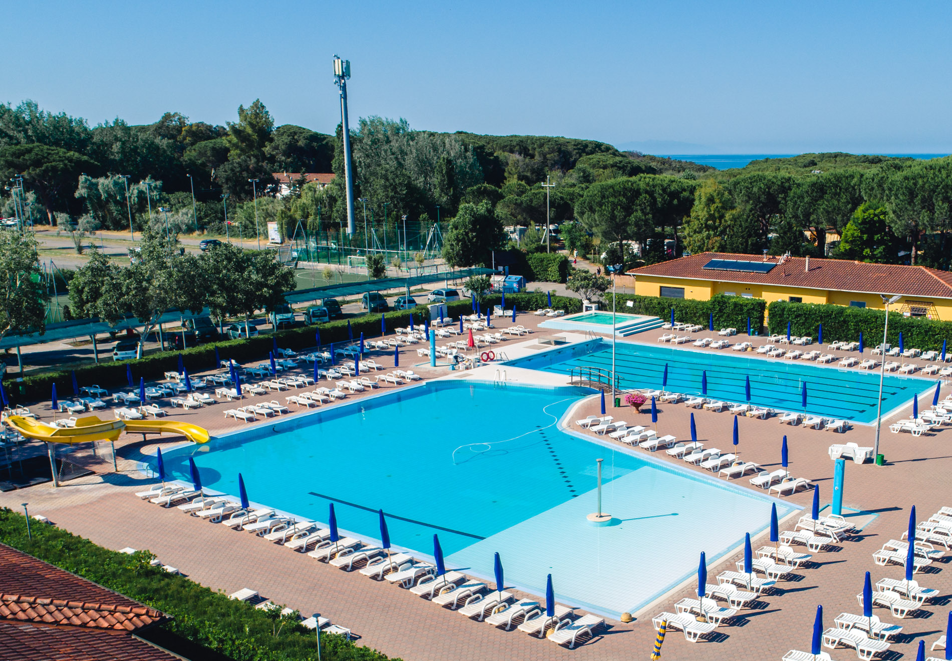 Der zentrale Pool, mit zunehmender Tiefe und einem seichteren Bereich für die Kinder, ist ideal für erholsame Momente. Sie können im Wasser bleiben und sich bräunen oder Ihren Kindern zusehen, wie sie auf der Wasserrutsche spielen. Und wenn Sie Durst haben, finden Sie unsere Bar in unmittelbarer Nähe zu Ihrem Liegestuhl.