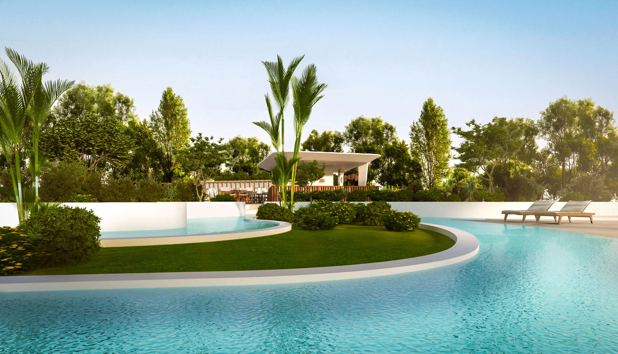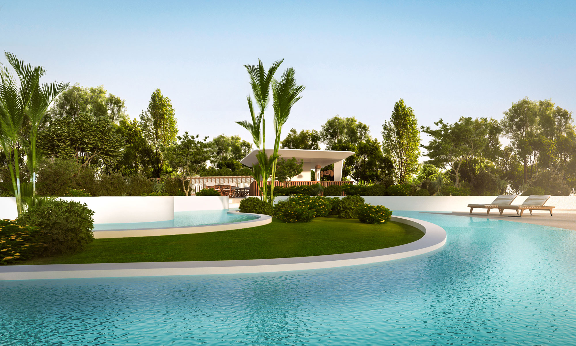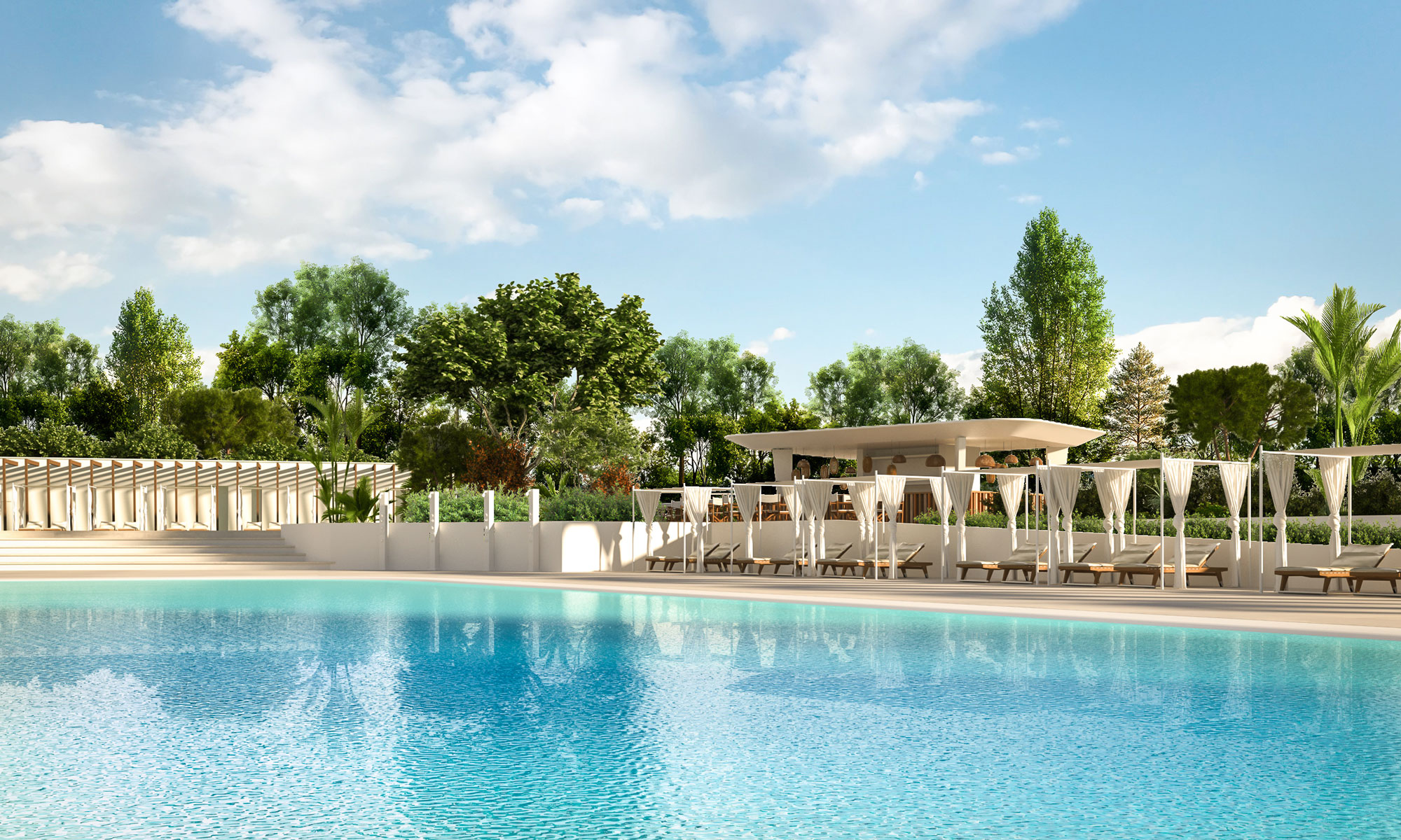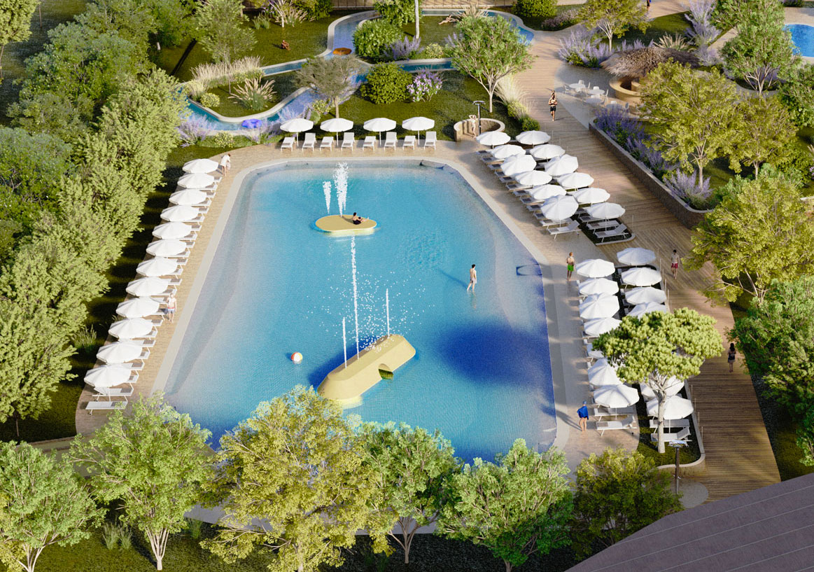 Scenografica piscina river con un percorso d’acqua che regalerà un’esperienza di totale relax immersi nella natura.