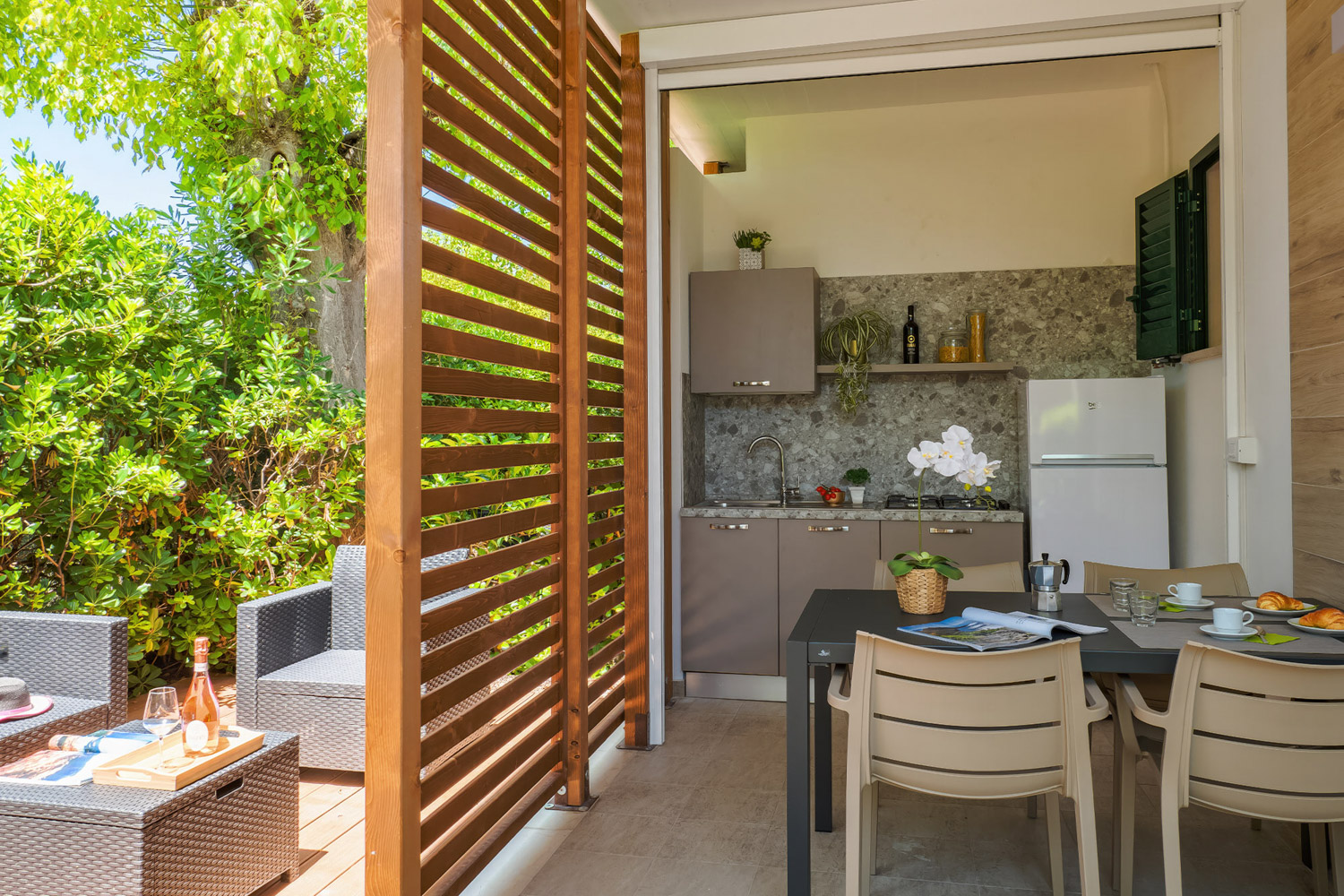 Una soluzione perfetta per chi cerca privacy e autonomia, ma con tutti i servizi del villaggio a portata di mano. Il cottage ti offre ampi spazi pensati per vivere la vacanza come a casa tua: camere confortevoli dove ricaricare le energie, un angolo cottura attrezzato per preparare i tuoi piatti preferiti, un soggiorno e una veranda coperta dove goderti il primo caffè del mattino o un aperitivo al tramonto.
