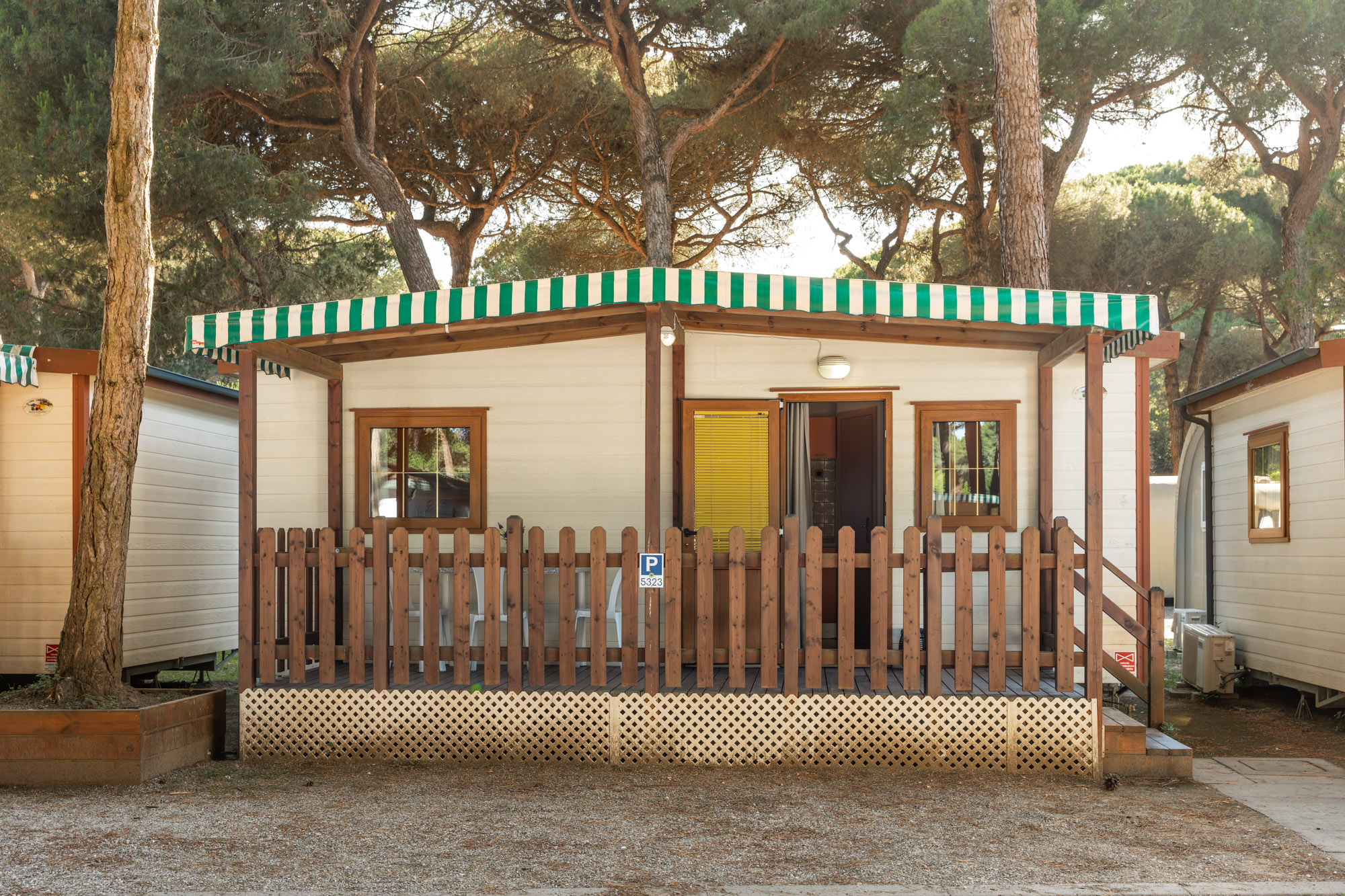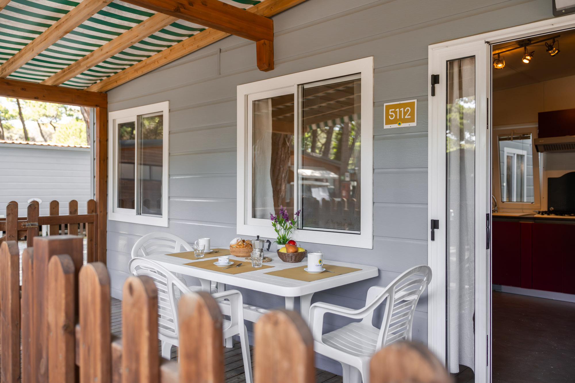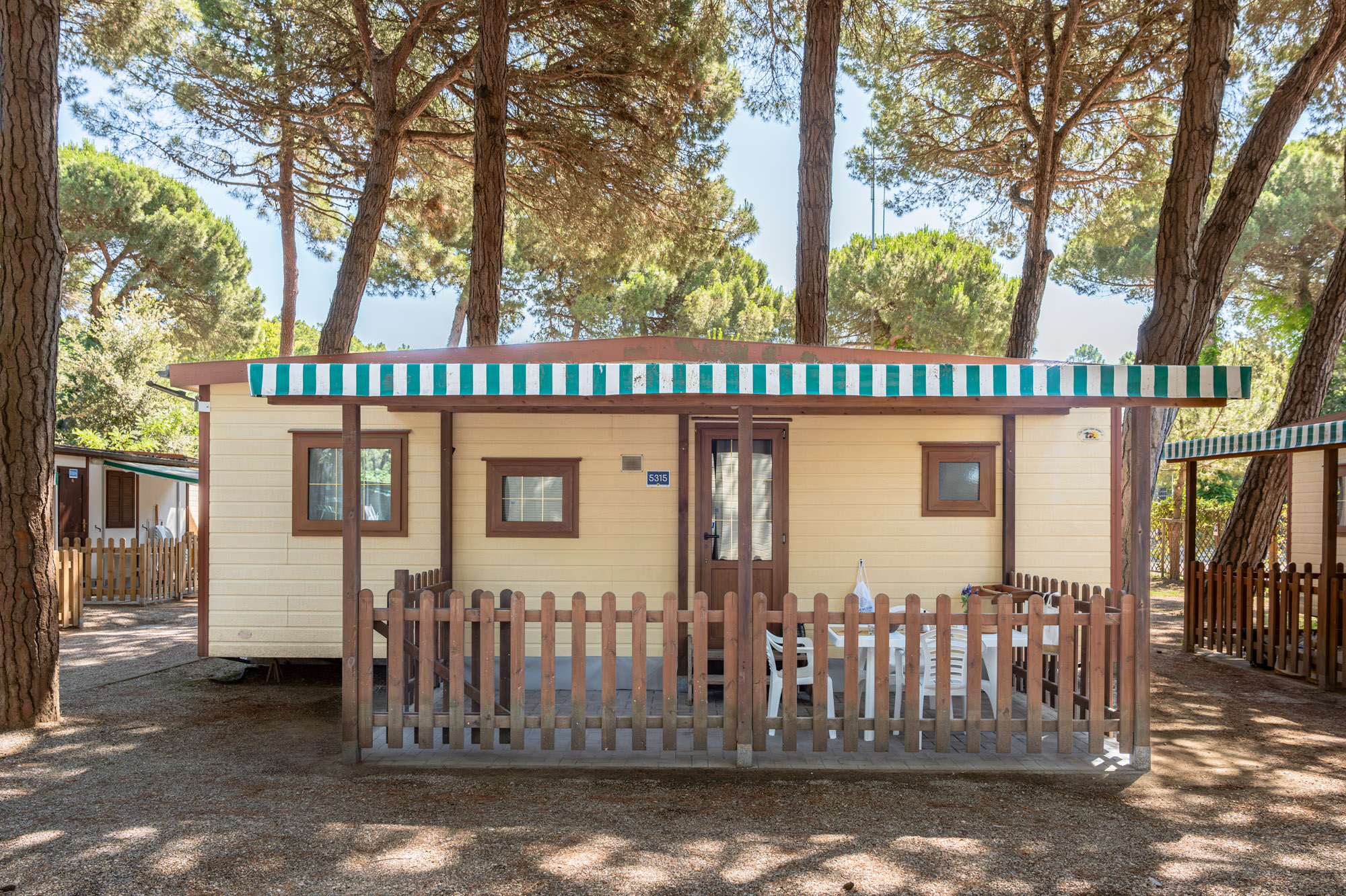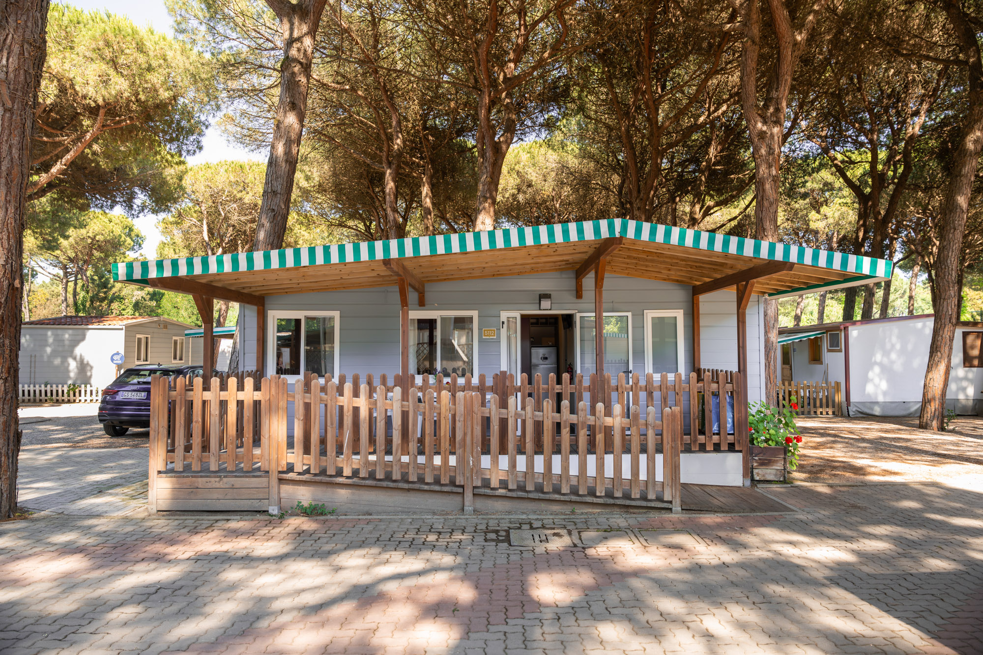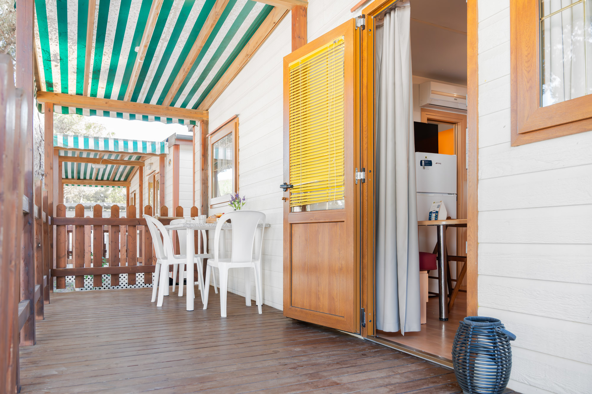 Komfort domku kempingowego w otoczeniu zieleni lasu sosnowego, z 2 sypialniami. Doskonałe rozwiązanie dla rodzin z dziećmi.