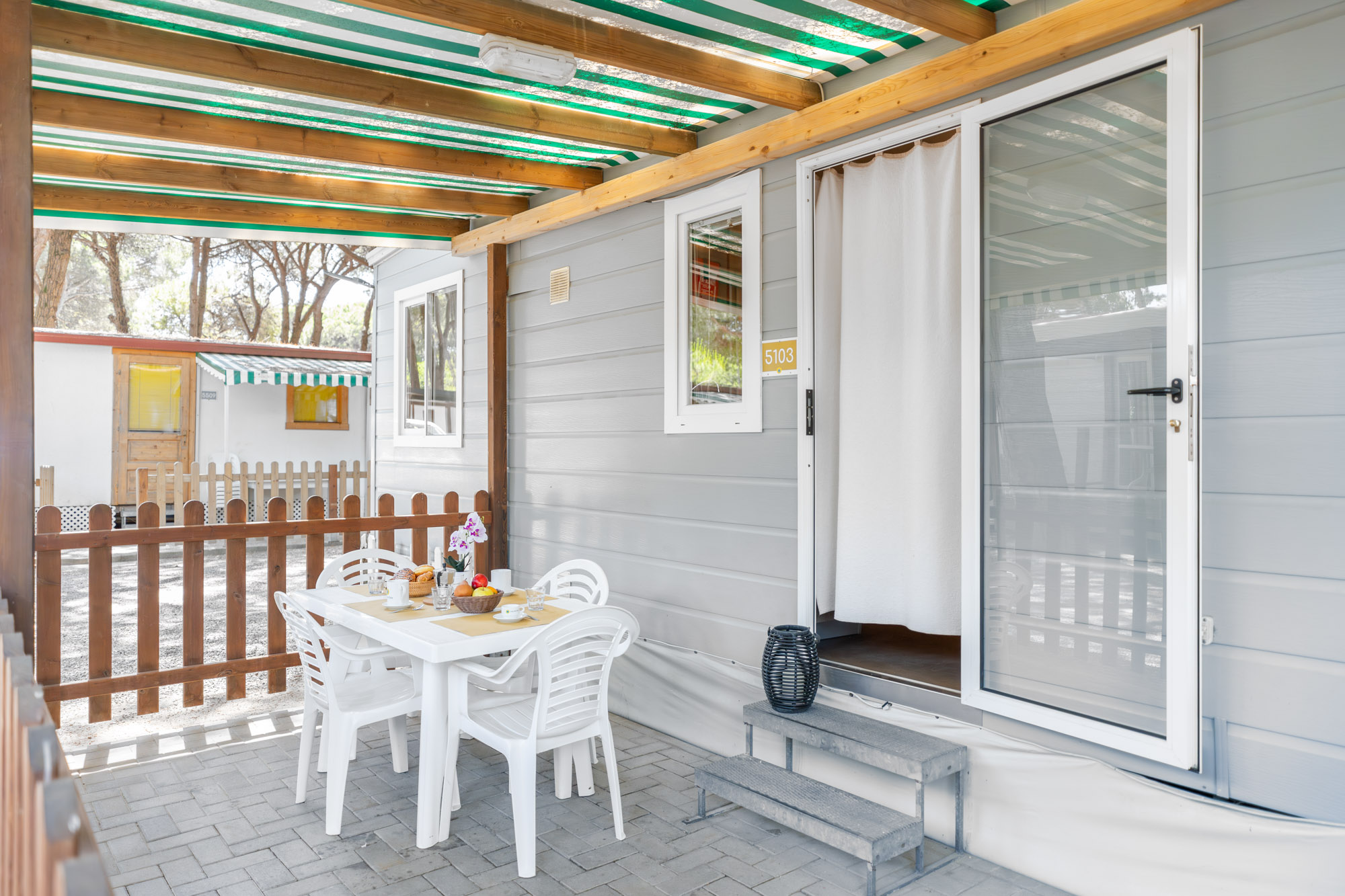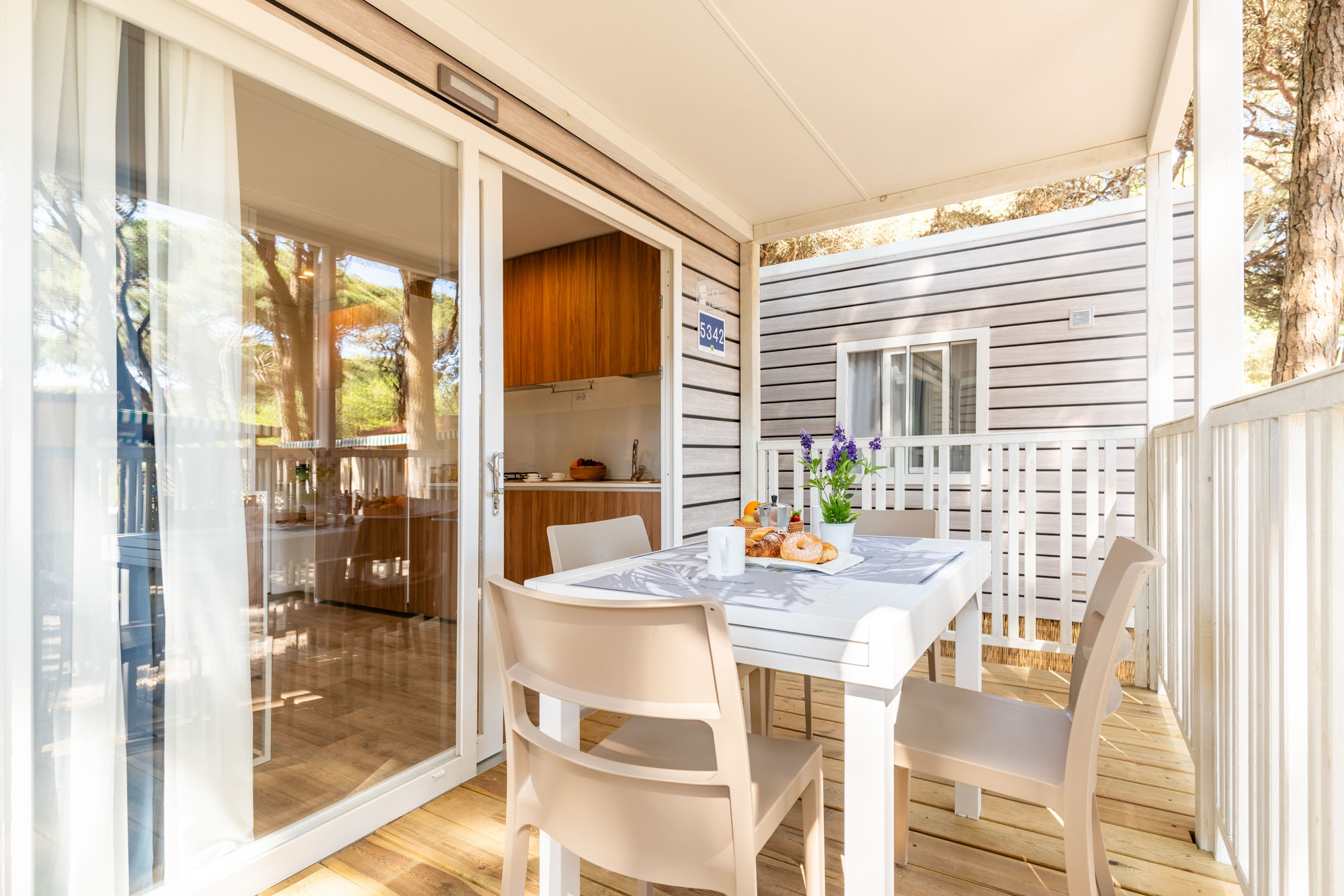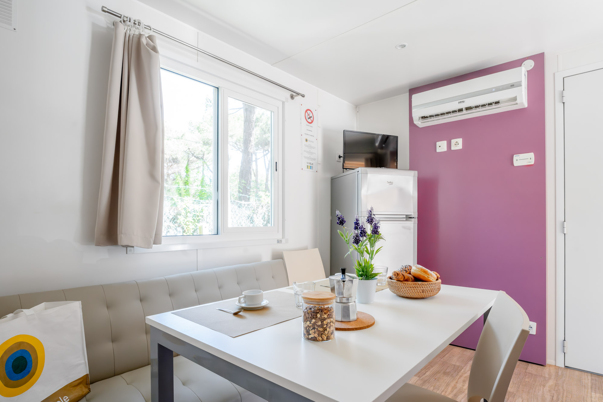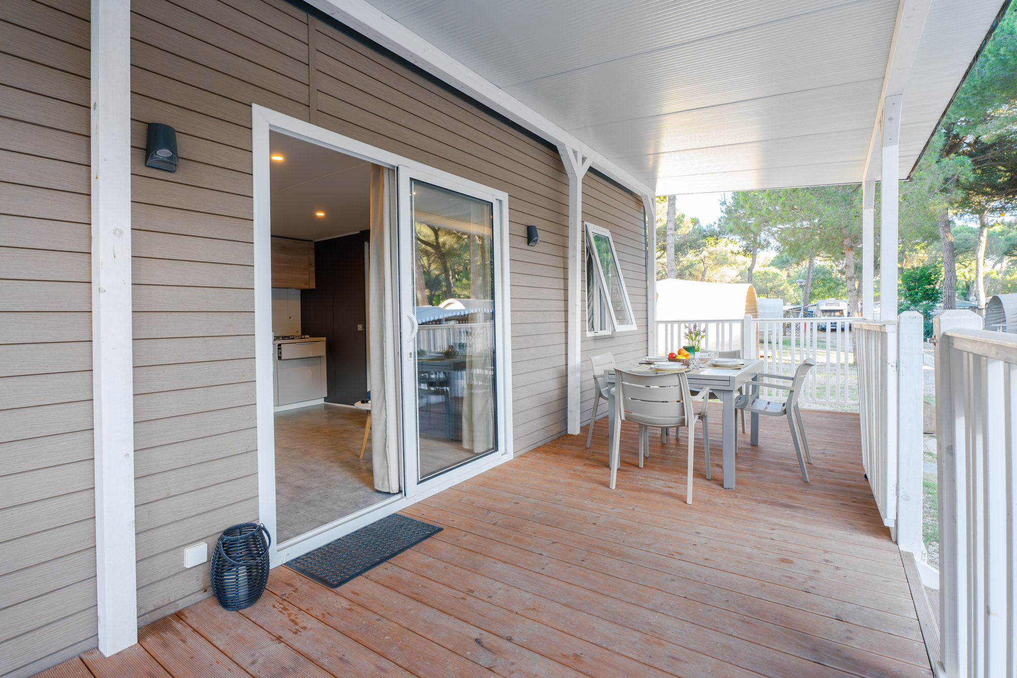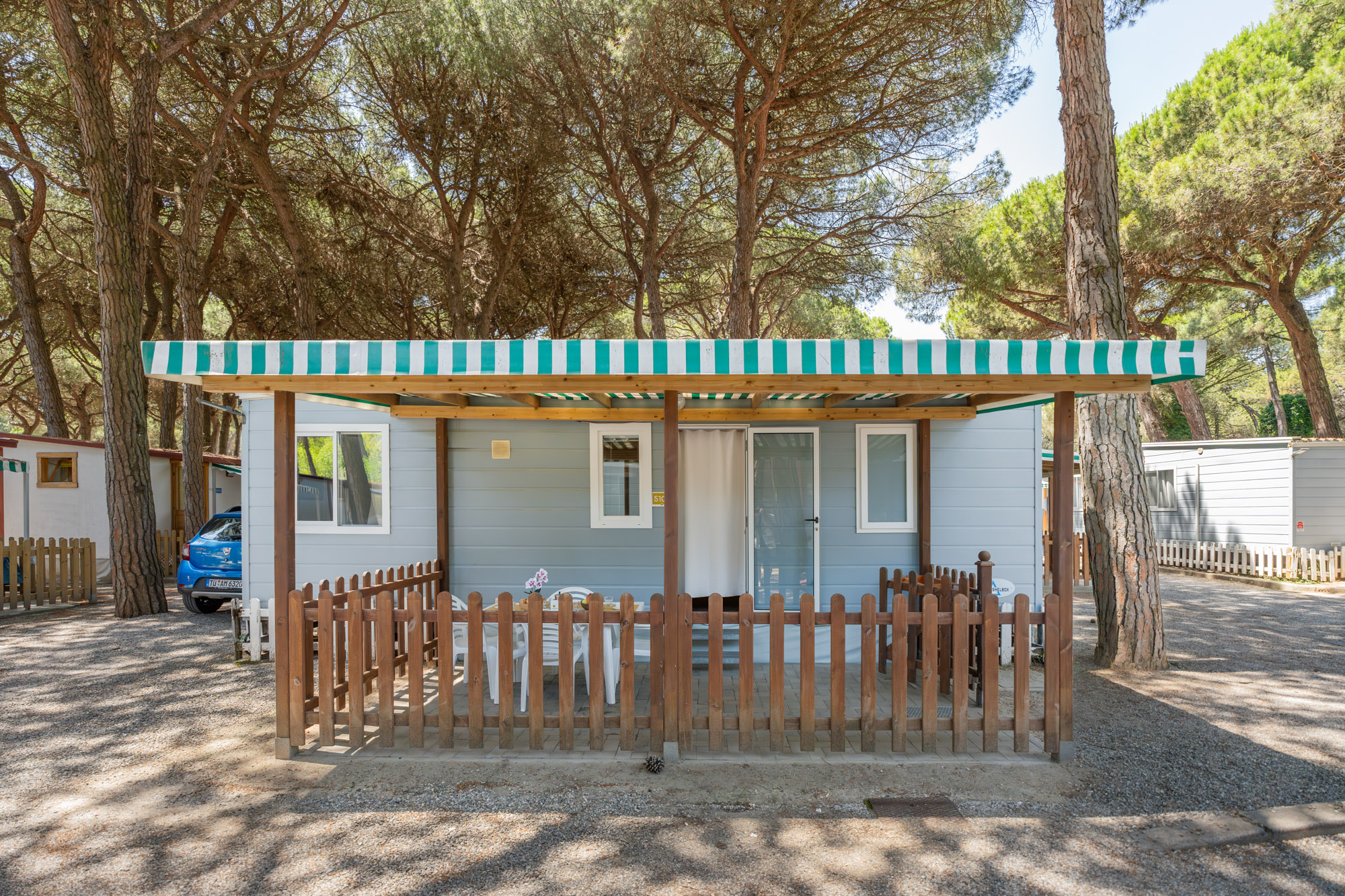 Komfort domku kempingowego w otoczeniu zieleni lasu sosnowego, z 2 sypialniami. Doskonałe rozwiązanie dla rodzin z dziećmi.