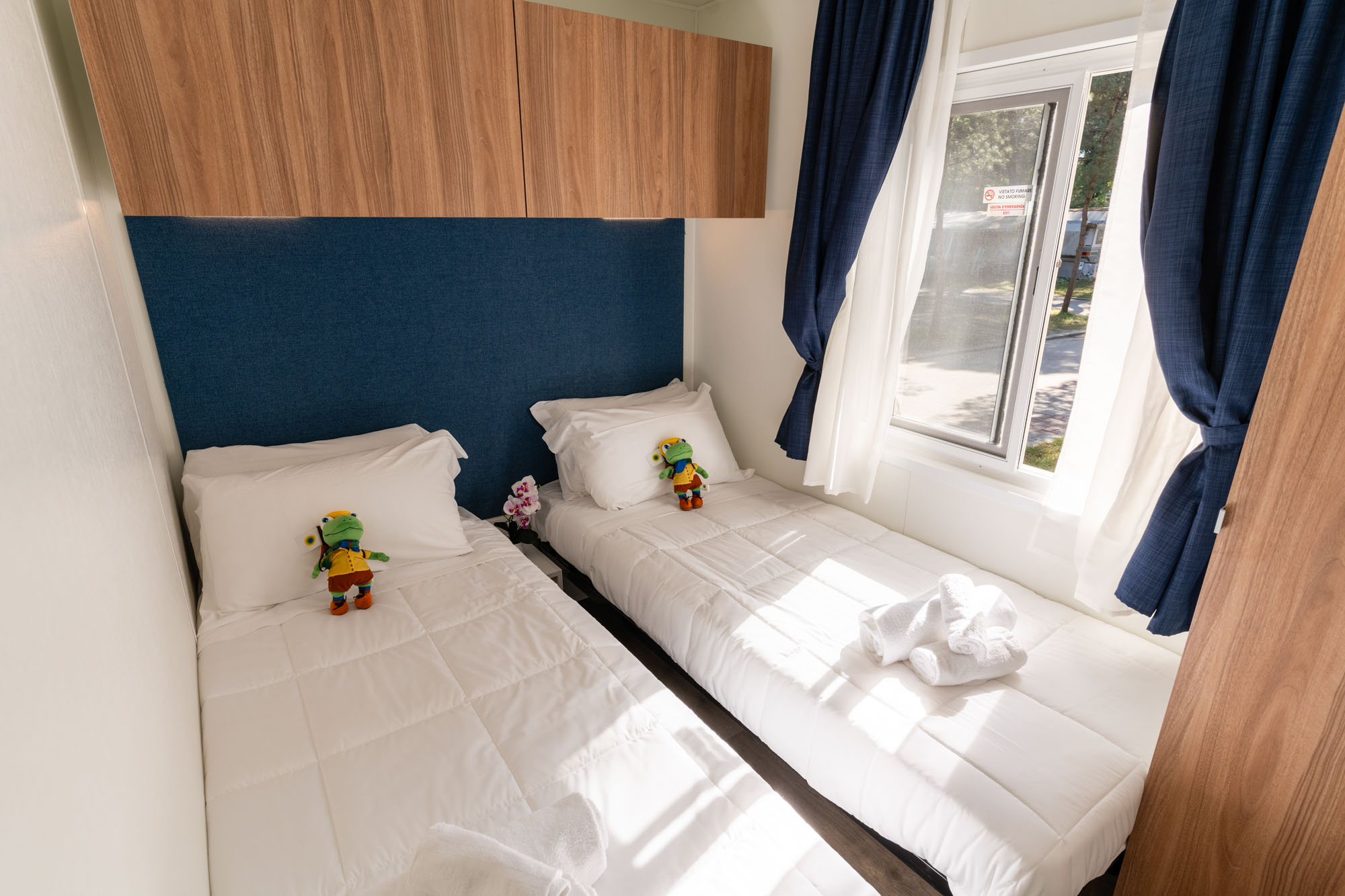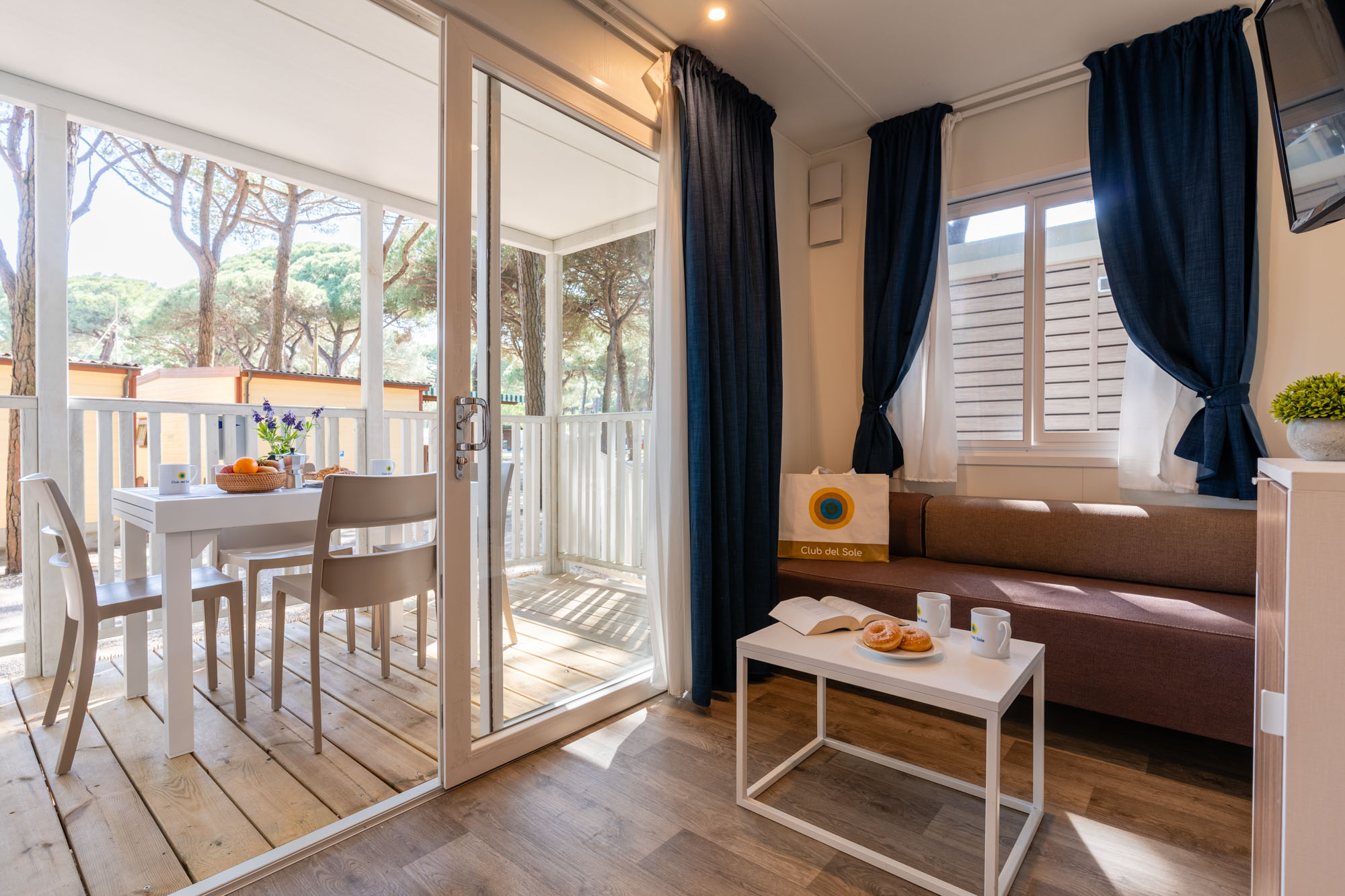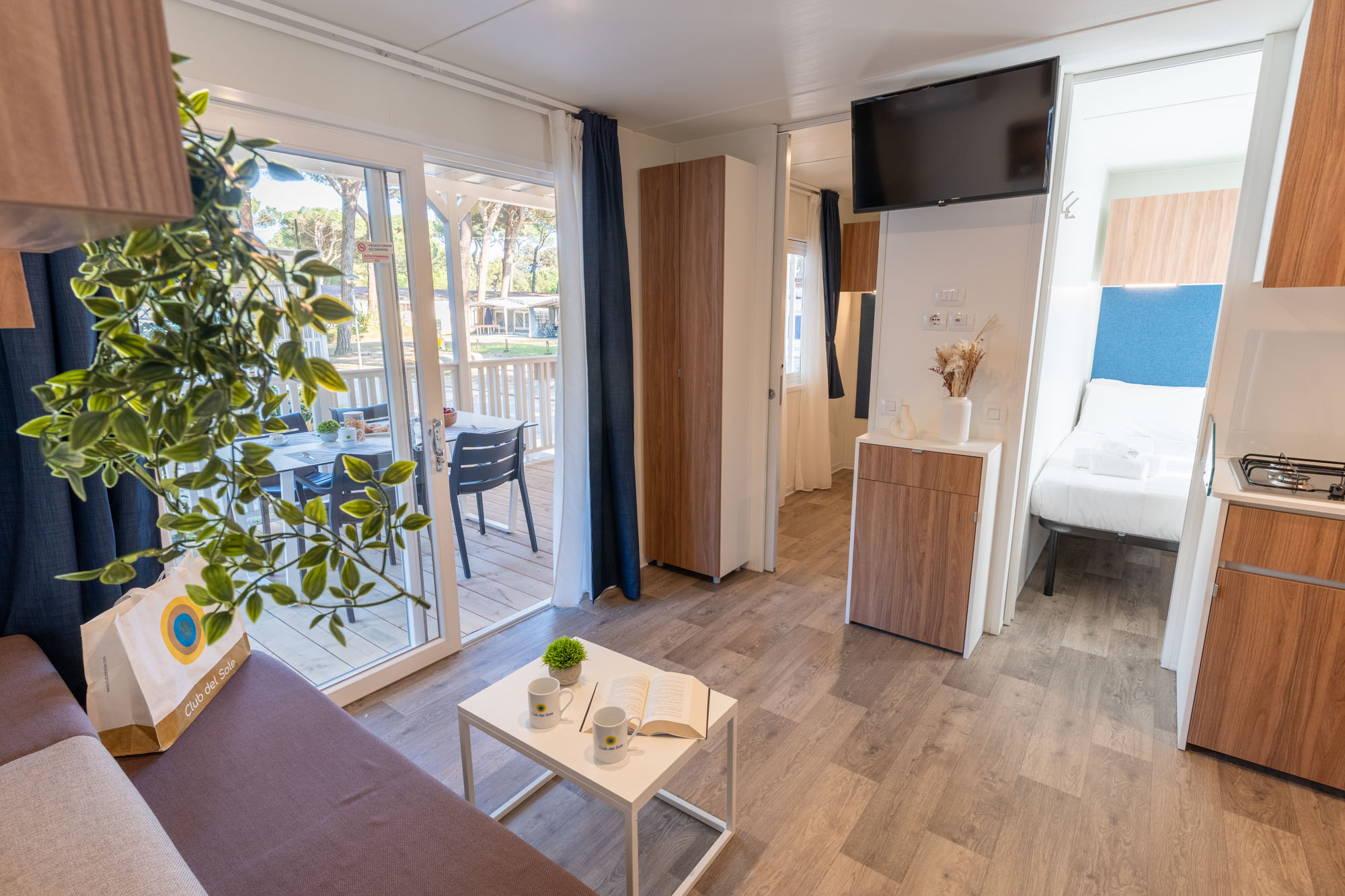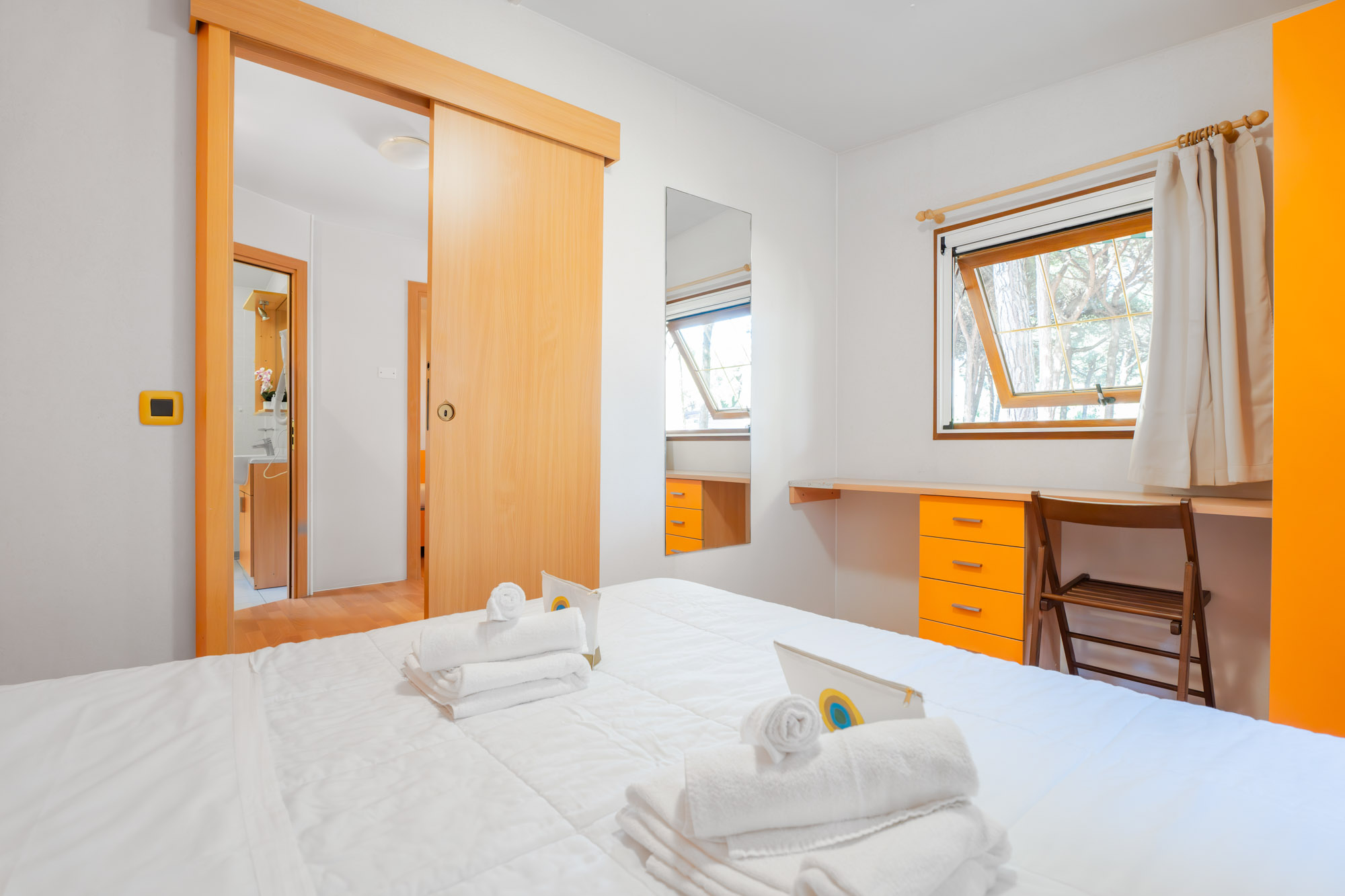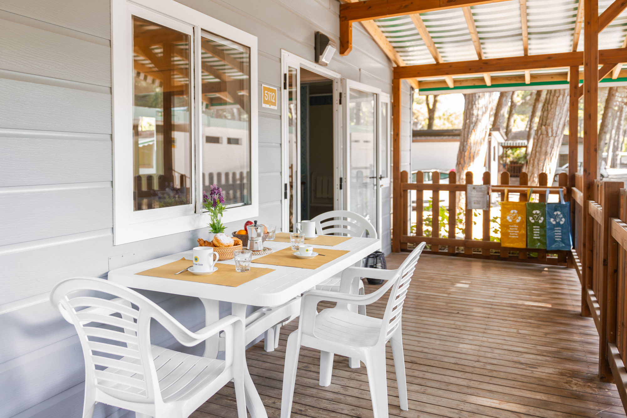 Komfort domku kempingowego w otoczeniu zieleni lasu sosnowego, z 2 sypialniami. Doskonałe rozwiązanie dla rodzin z dziećmi.
