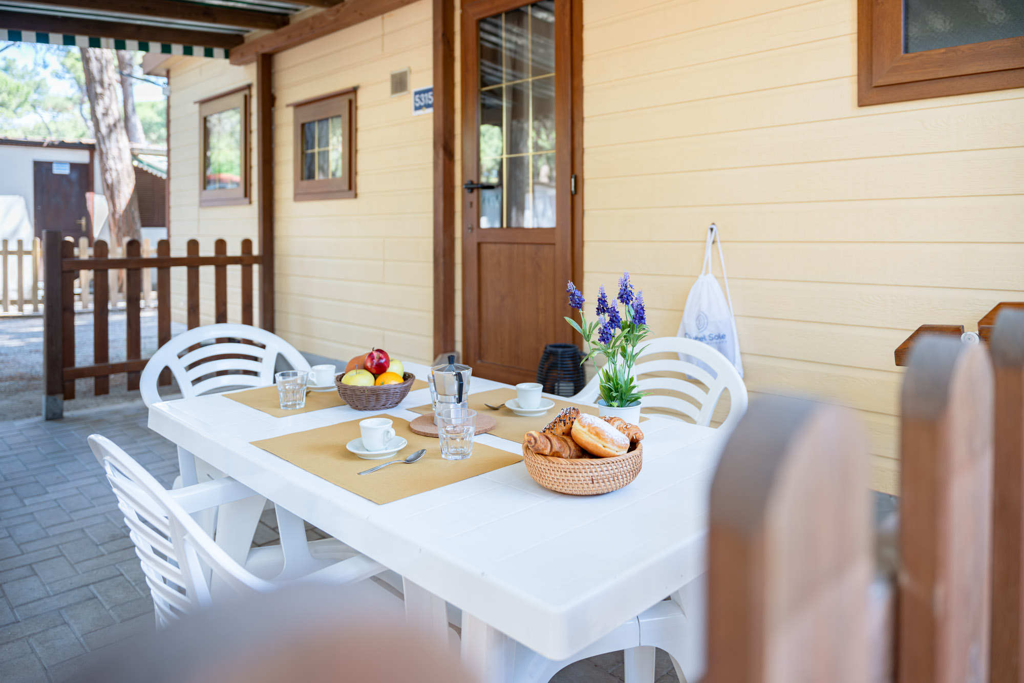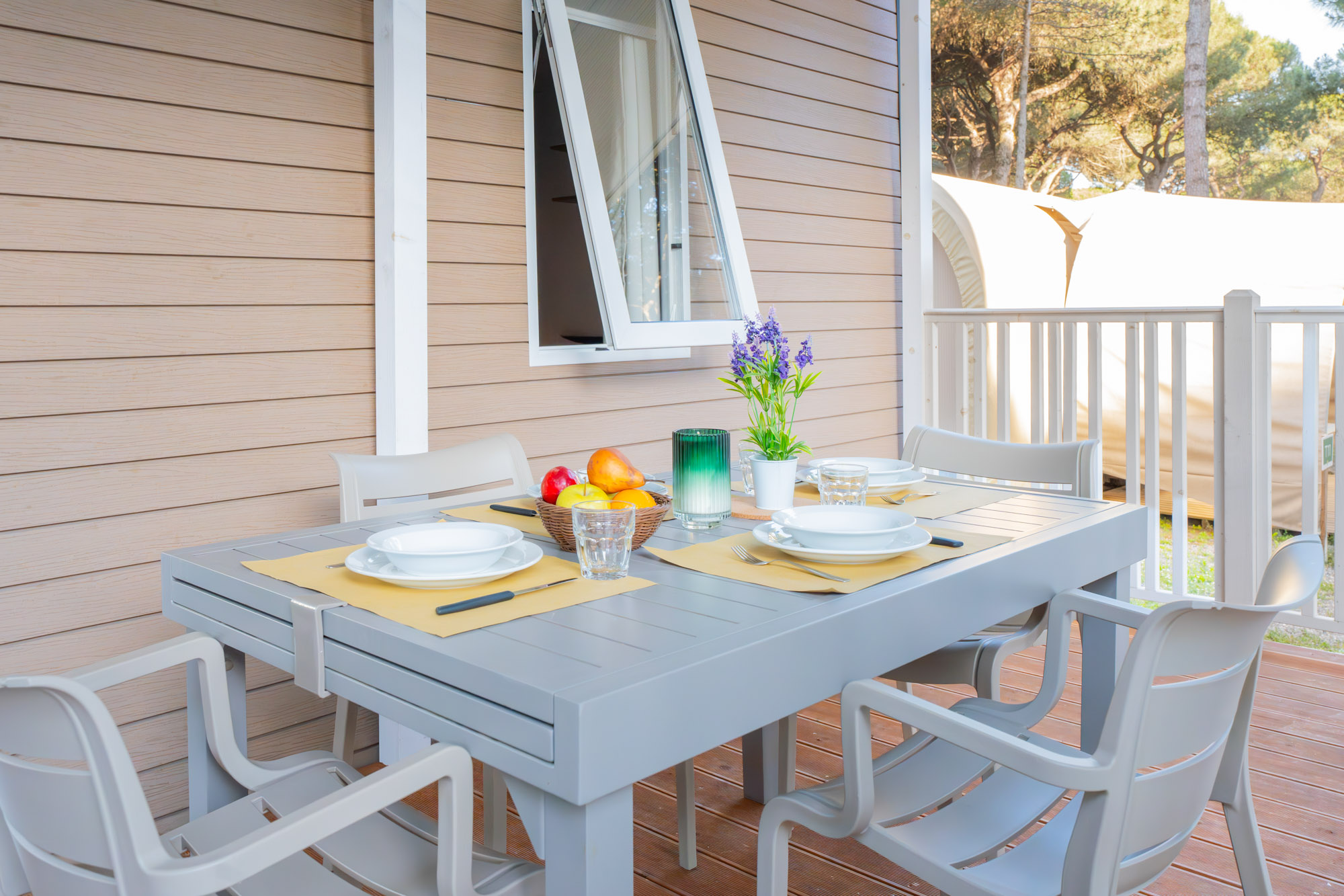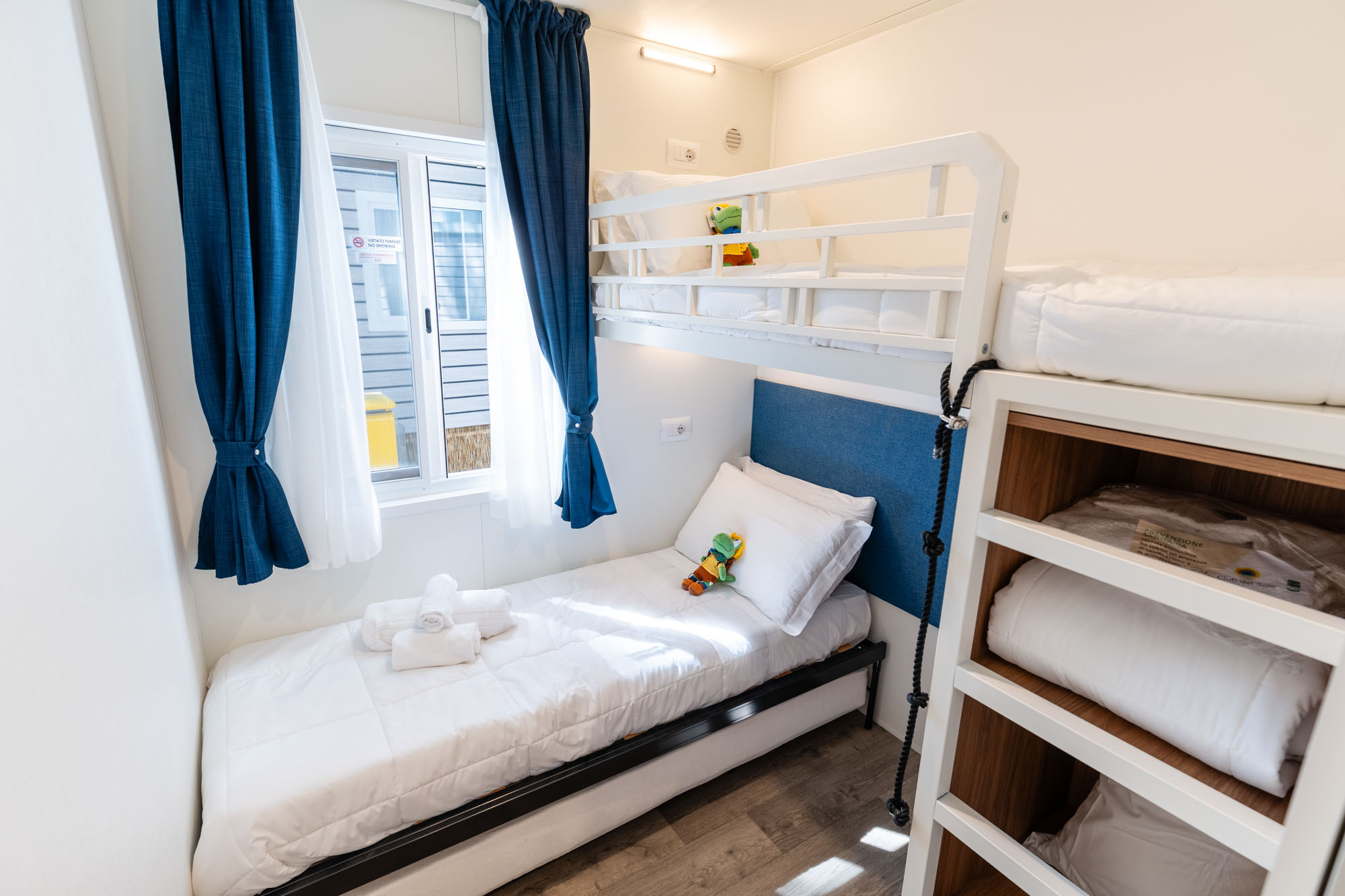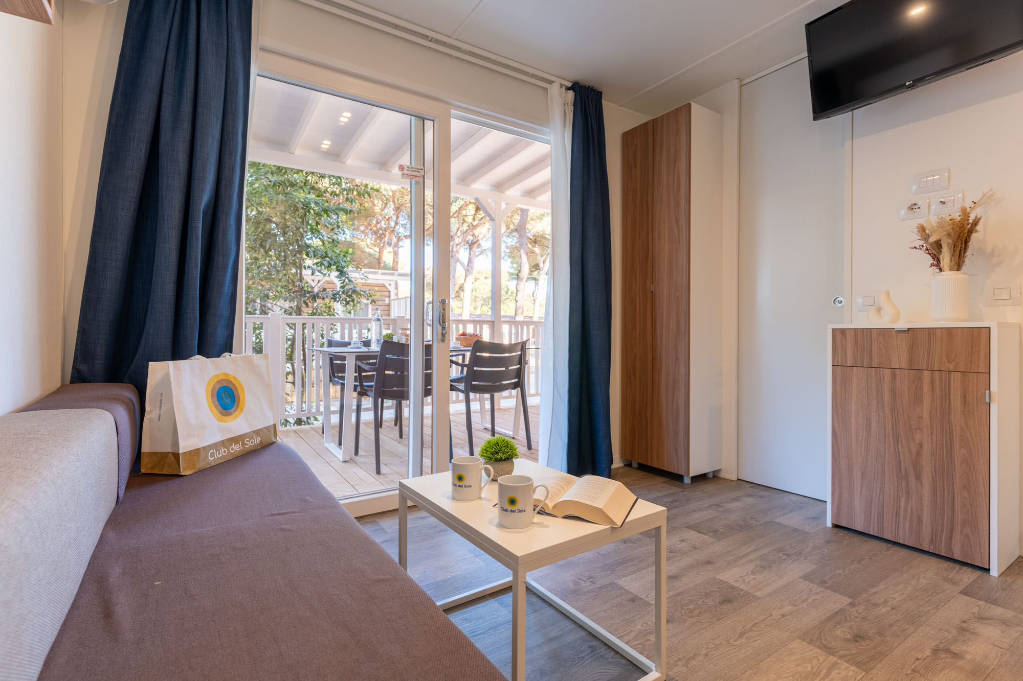 Komfort domku kempingowego w otoczeniu zieleni lasu sosnowego, z 2 sypialniami. Doskonałe rozwiązanie dla rodzin z dziećmi.