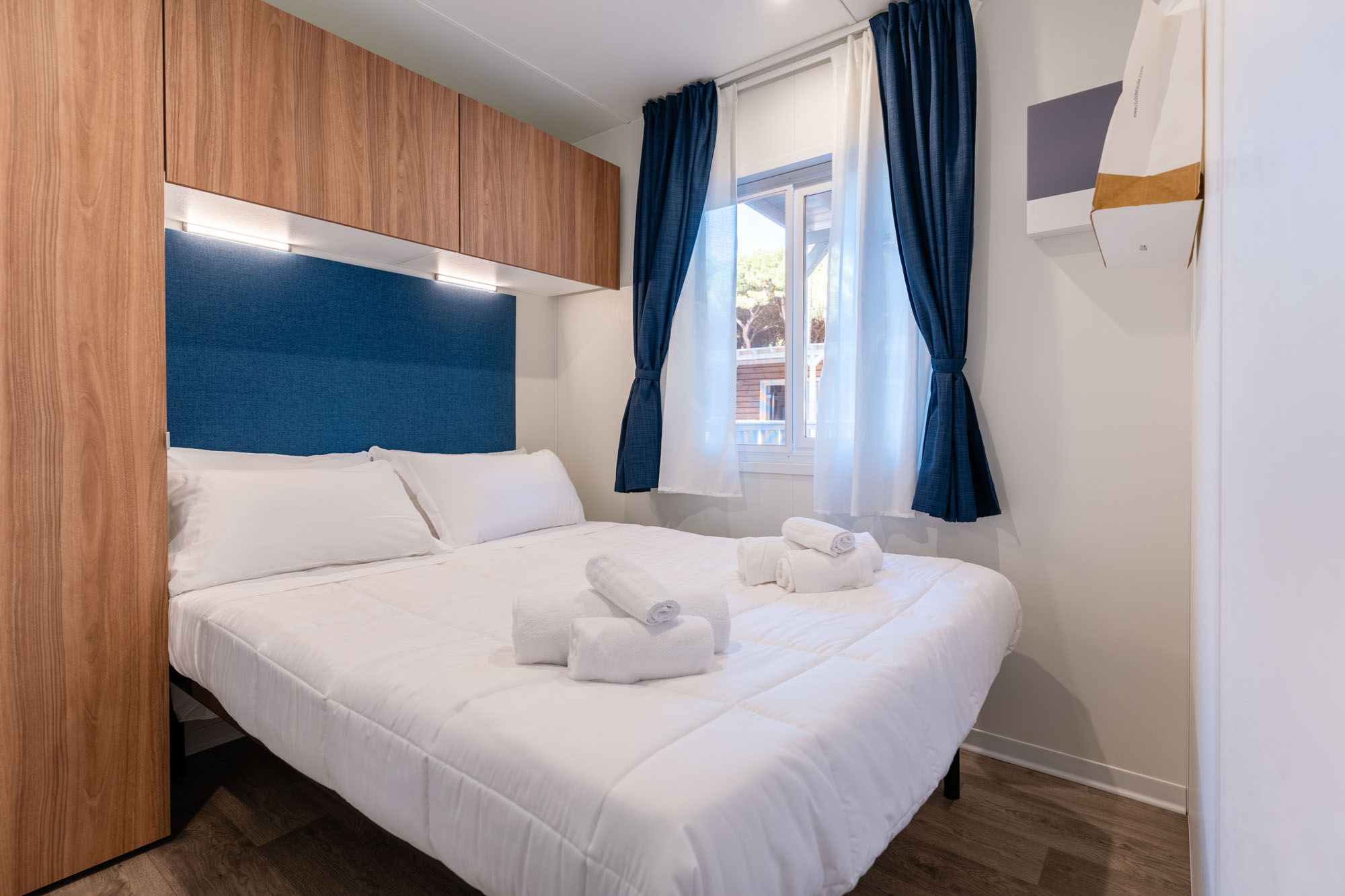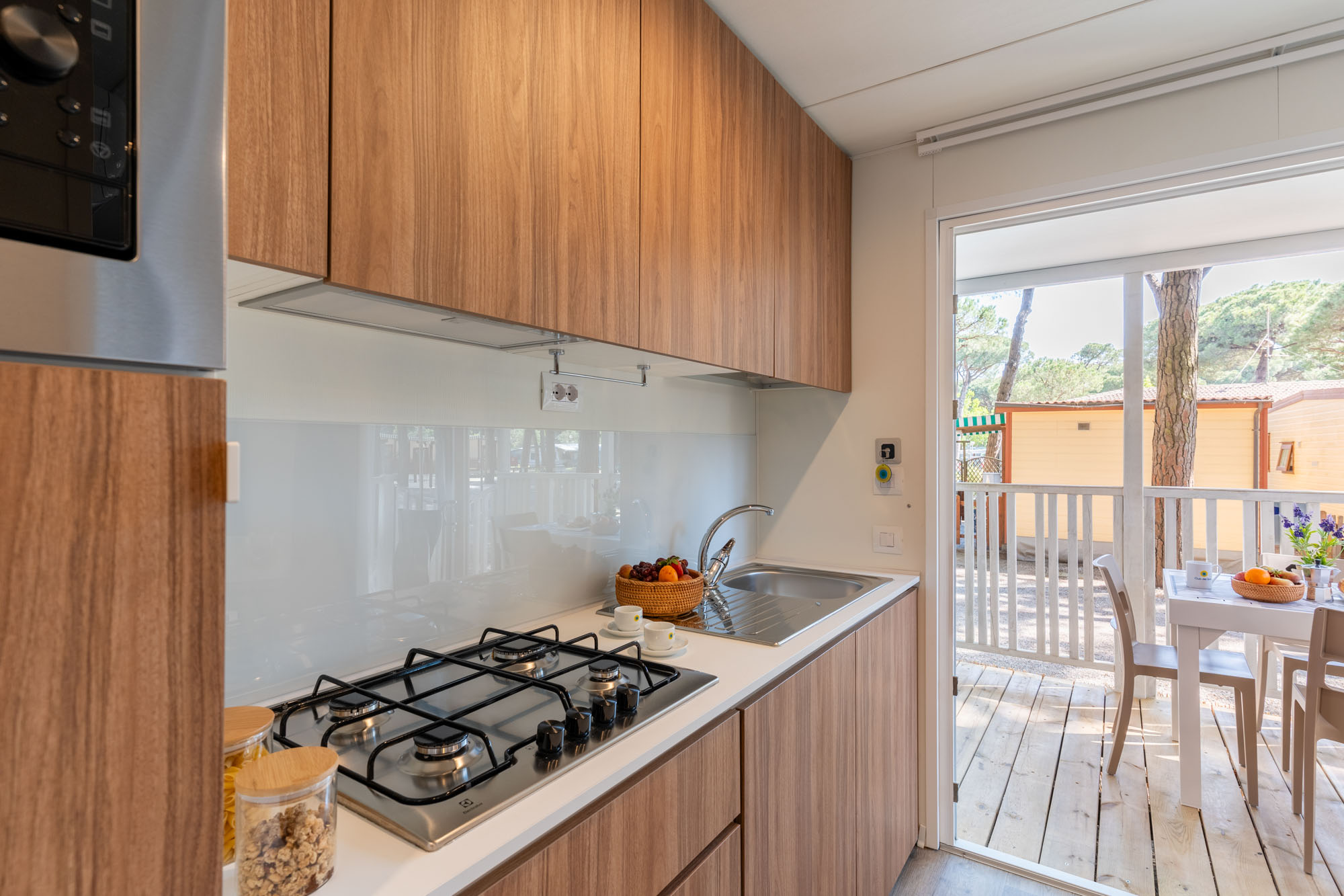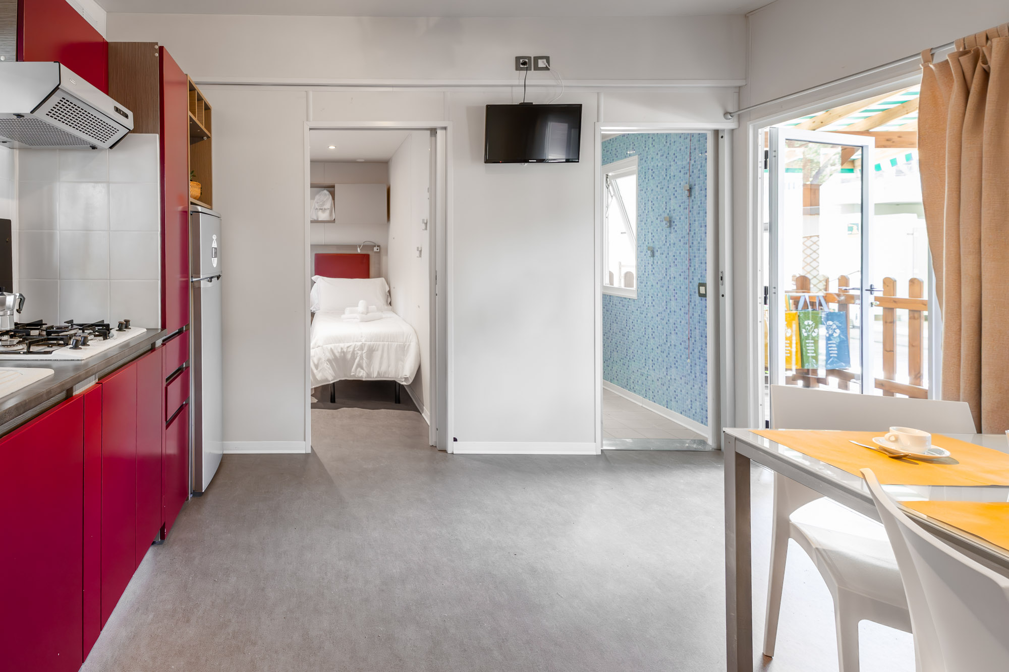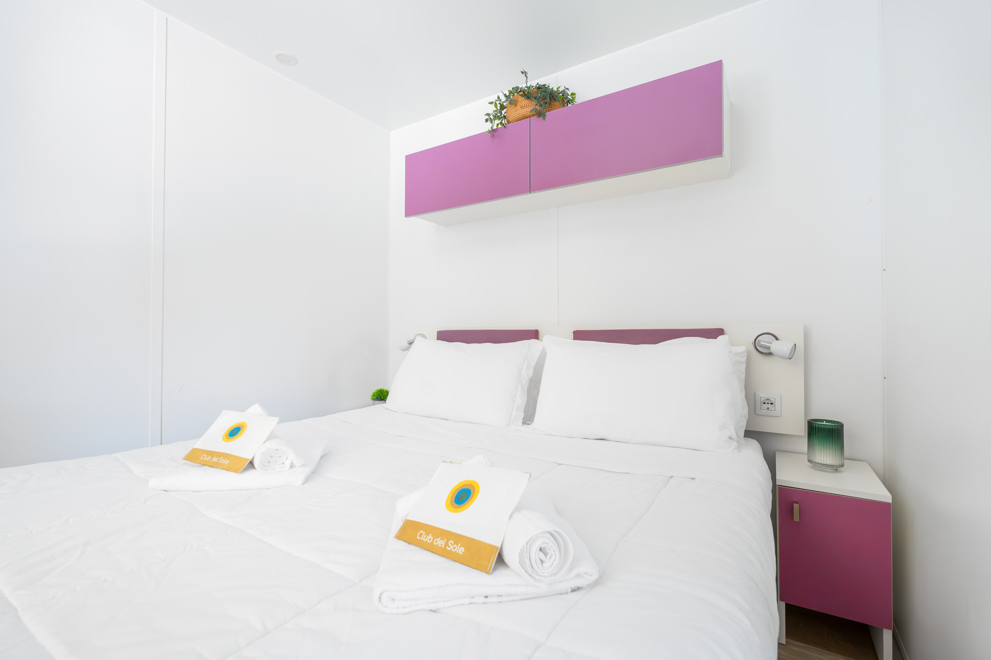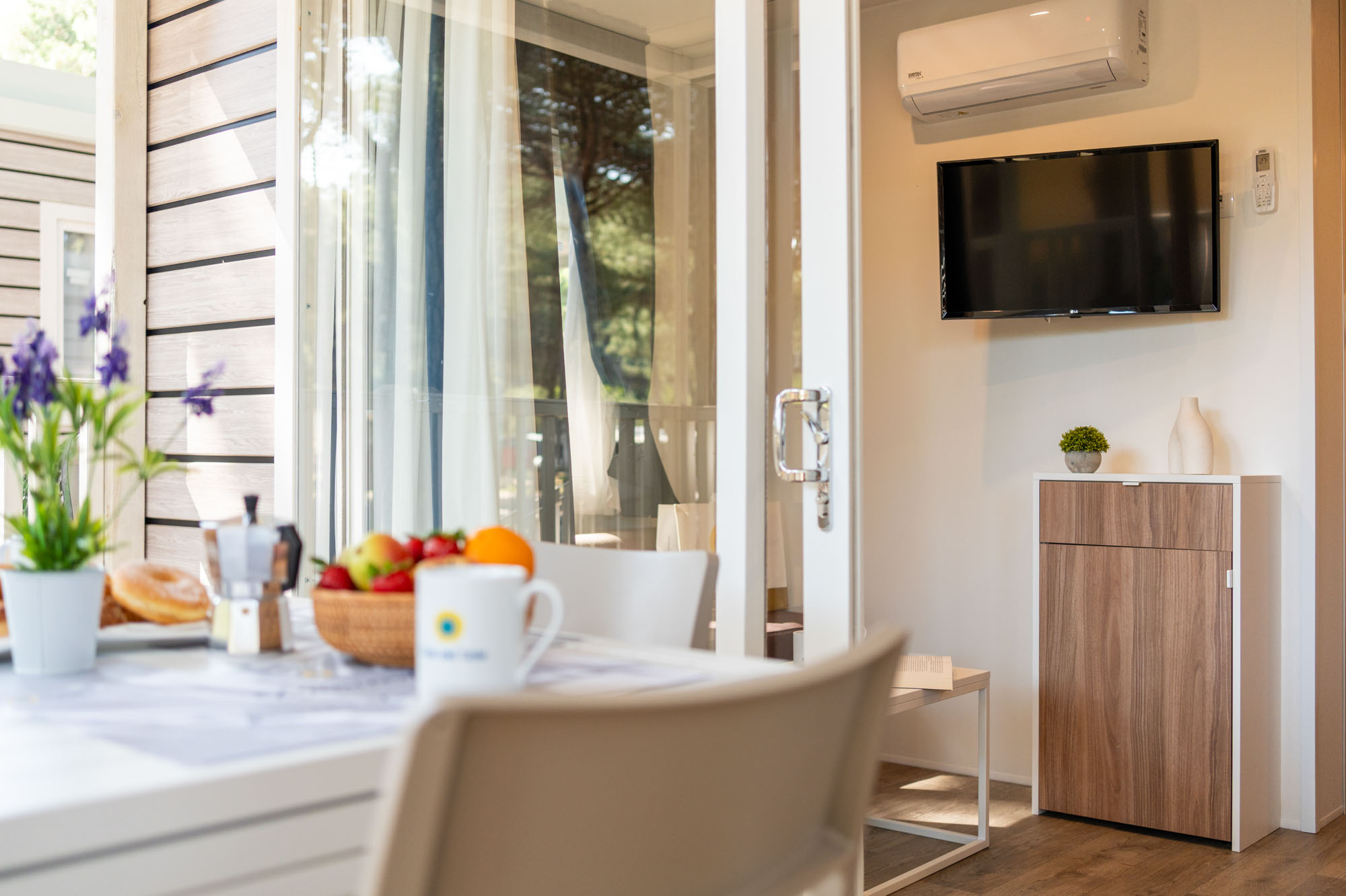 Komfort domku kempingowego w otoczeniu zieleni lasu sosnowego, z 2 sypialniami. Doskonałe rozwiązanie dla rodzin z dziećmi.