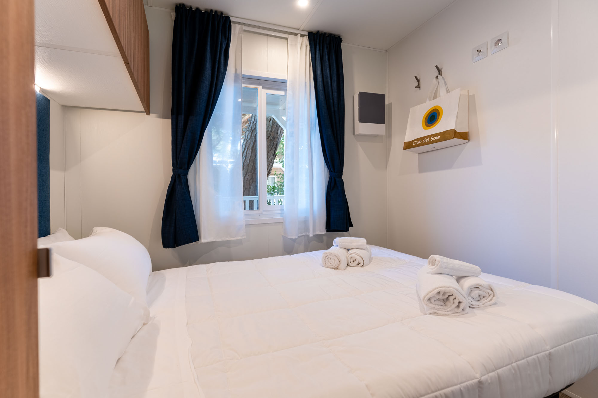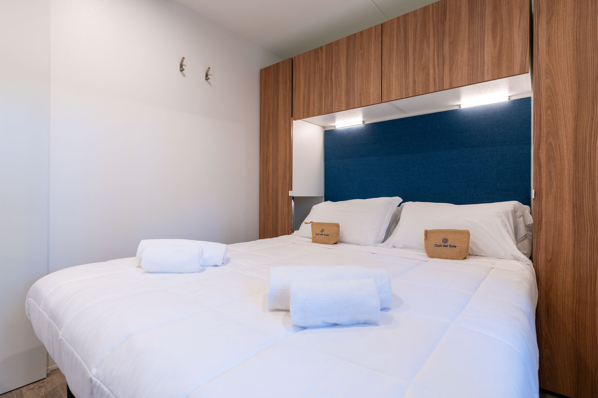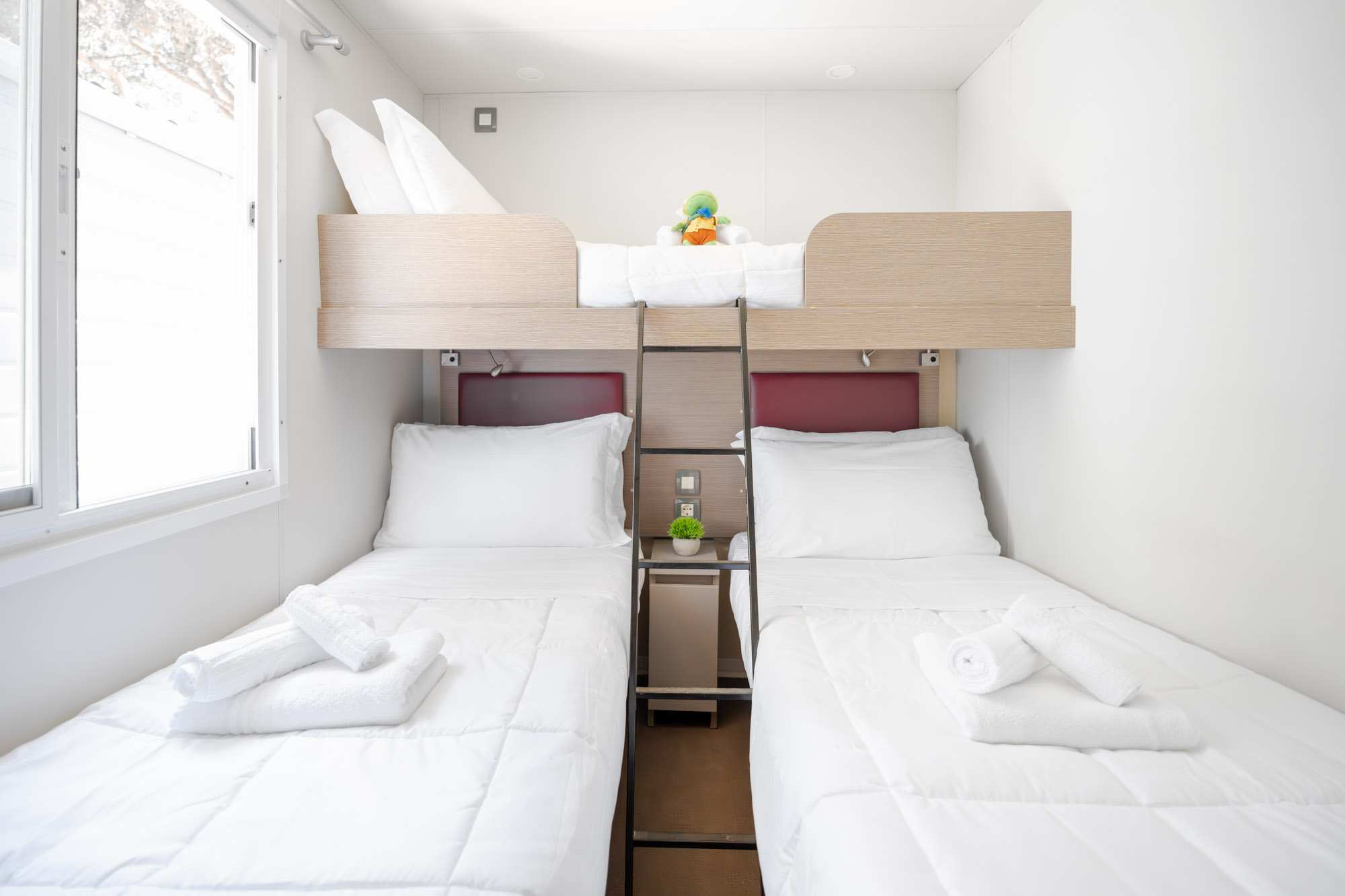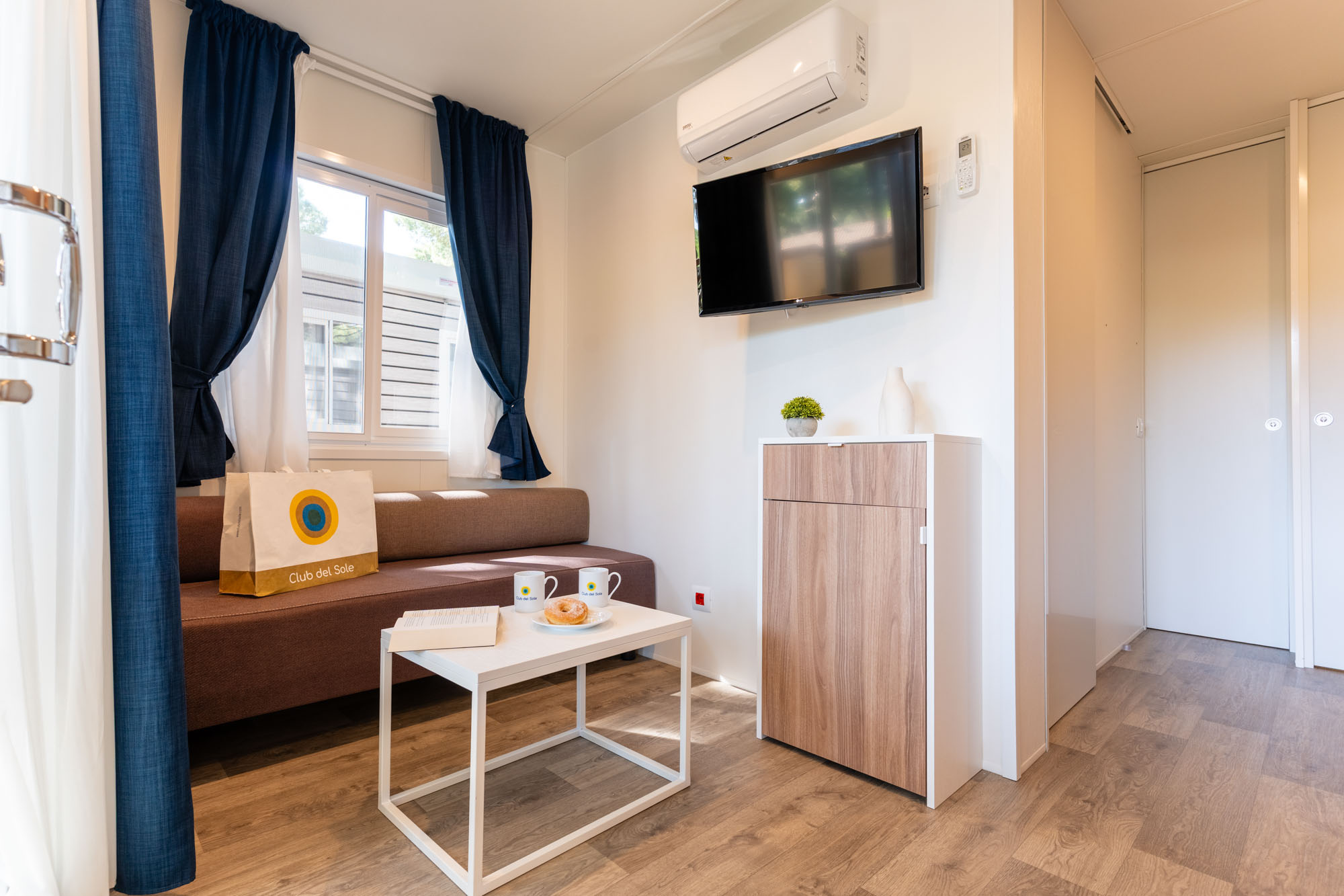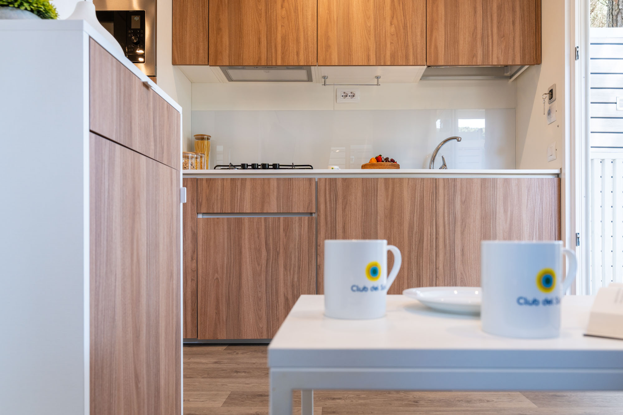 Komfort domku kempingowego w otoczeniu zieleni lasu sosnowego, z 2 sypialniami. Doskonałe rozwiązanie dla rodzin z dziećmi.