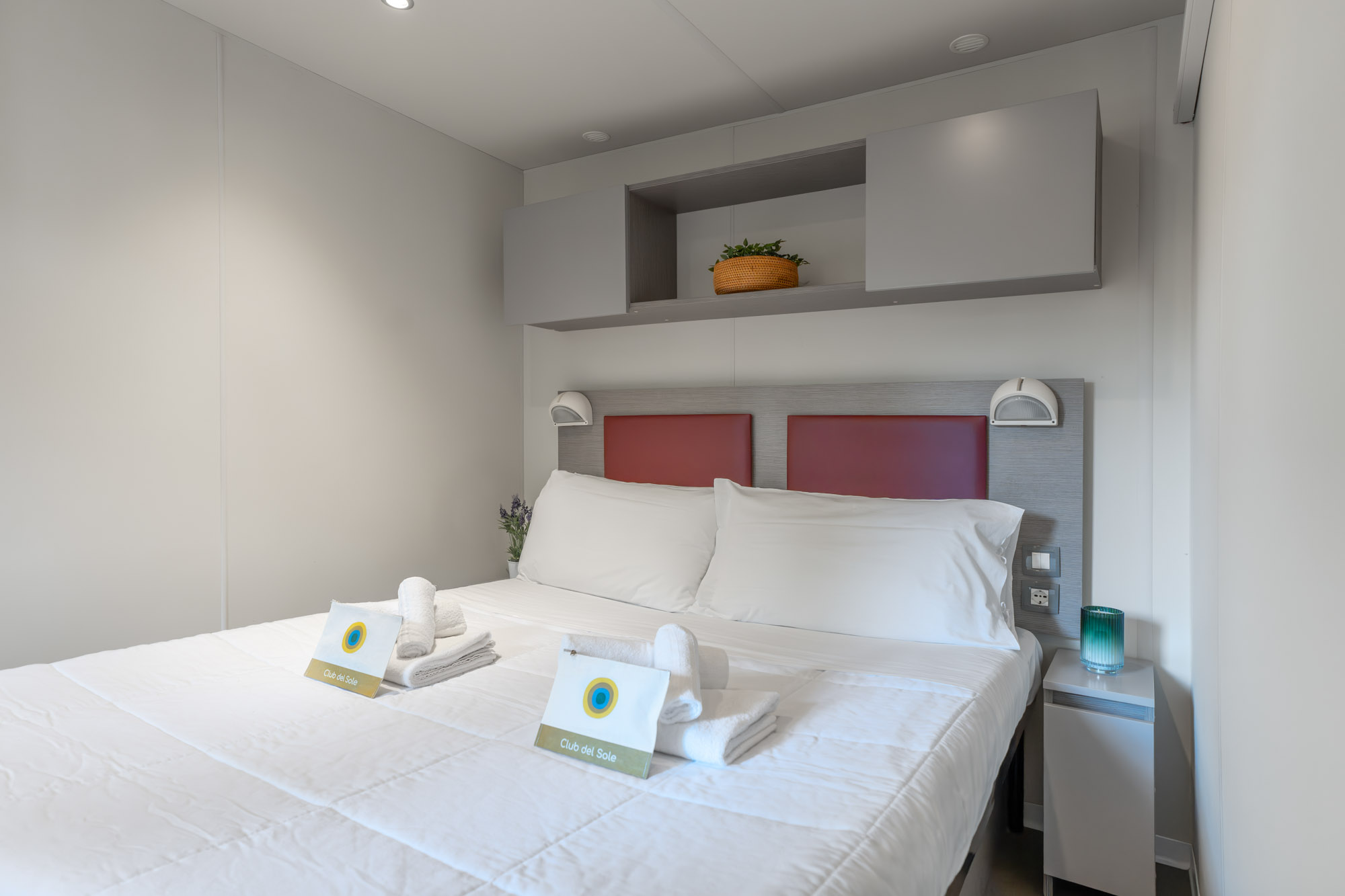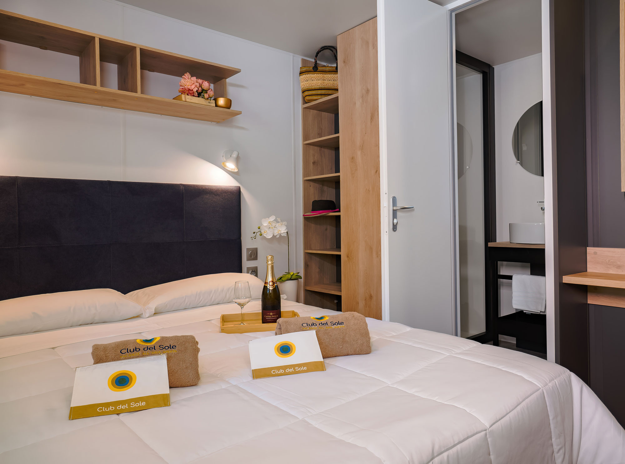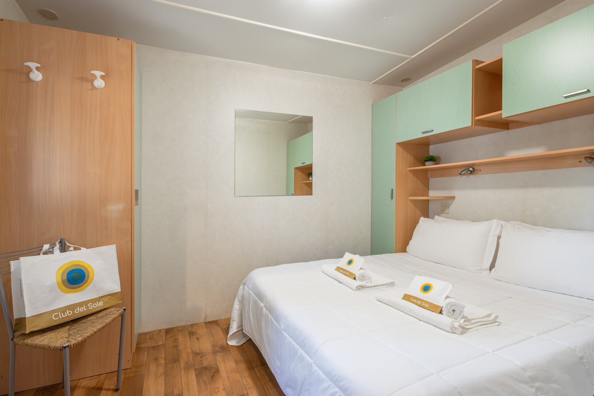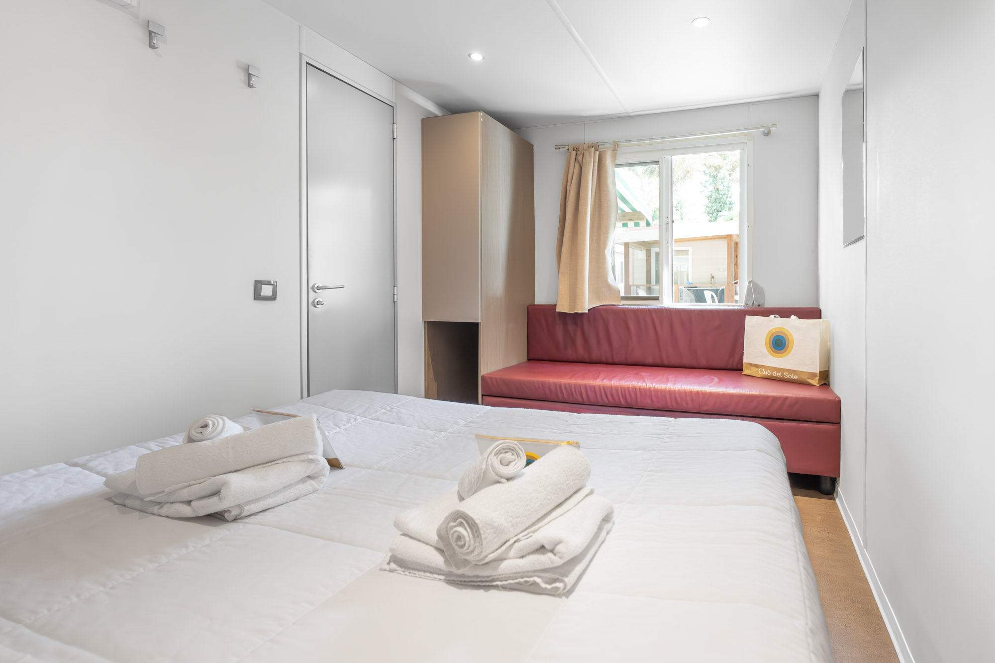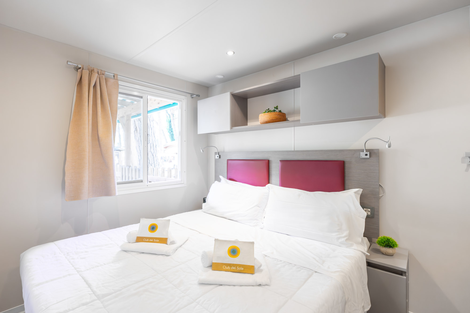Komfort domku kempingowego w otoczeniu zieleni lasu sosnowego, z 2 sypialniami. Doskonałe rozwiązanie dla rodzin z dziećmi.