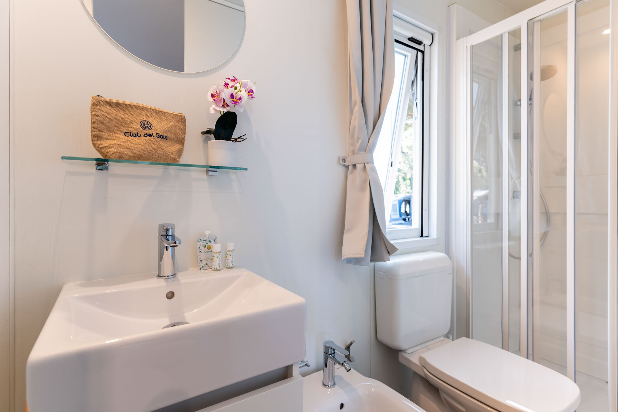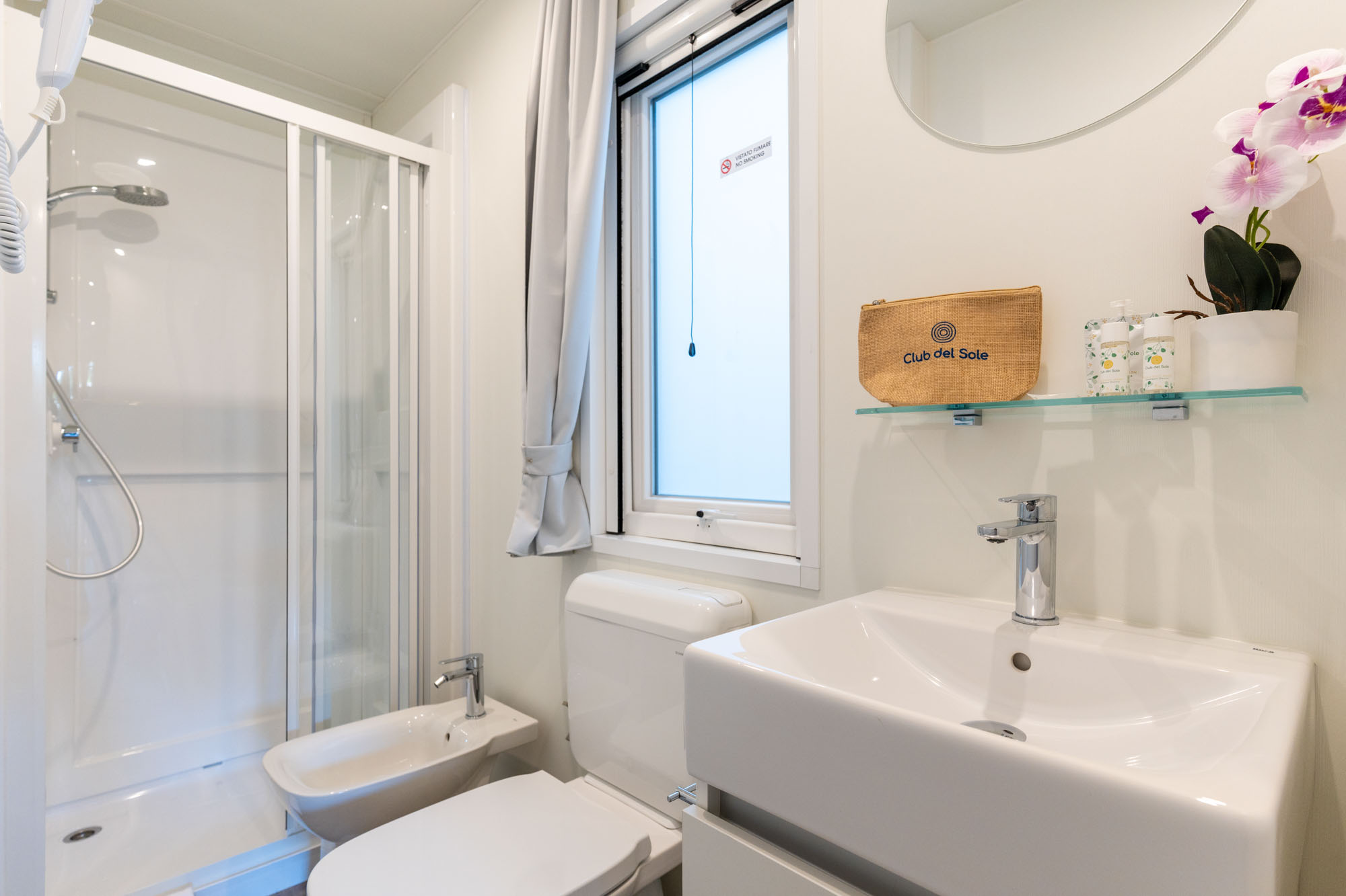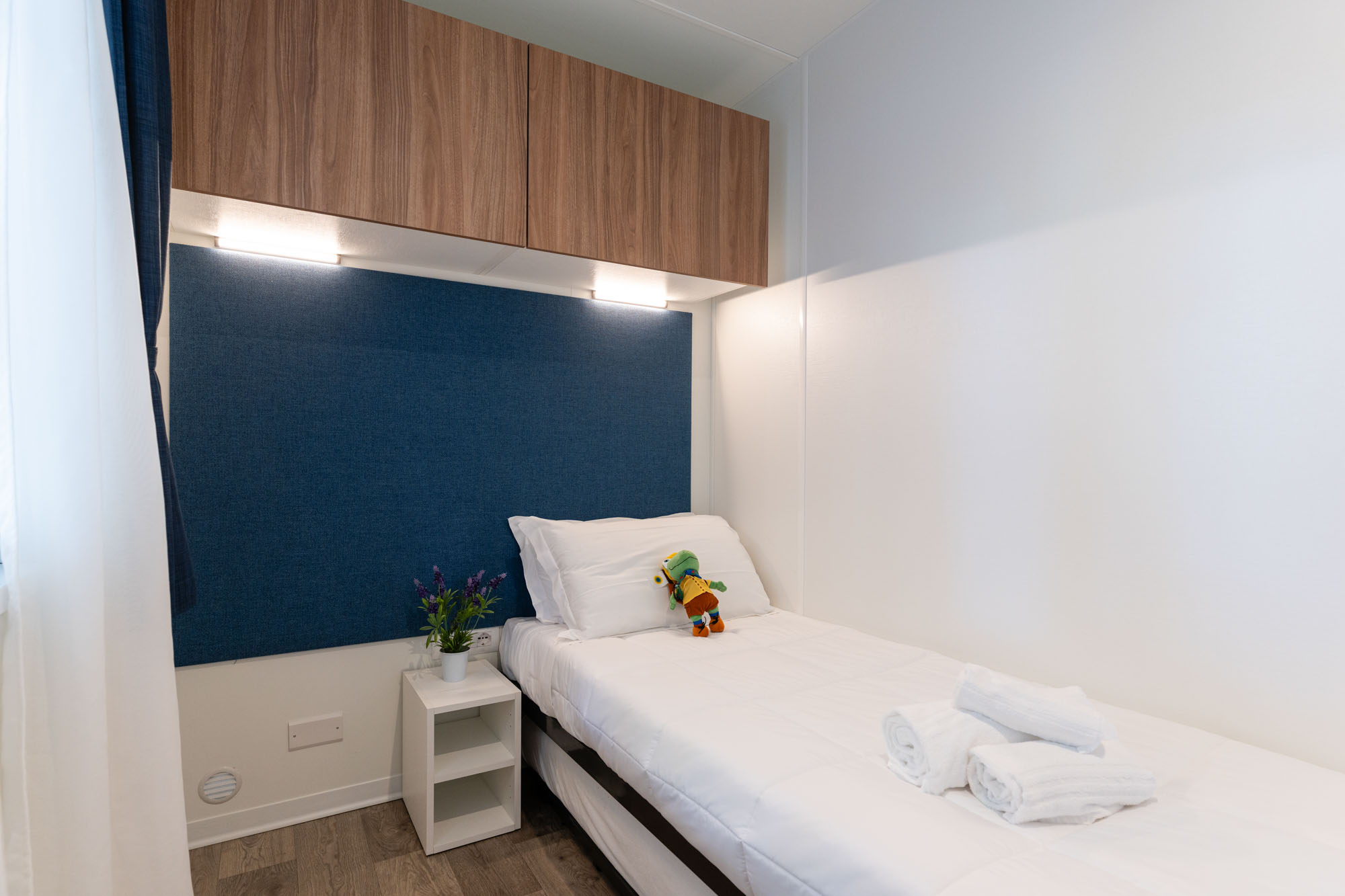 Wygodny i przestronny domek kempingowy z 2 sypialniami. Duża i wygodna weranda z rampą dla osób z niepełnosprawnościami, zapewniająca relaks i dostępność dla wszystkich.